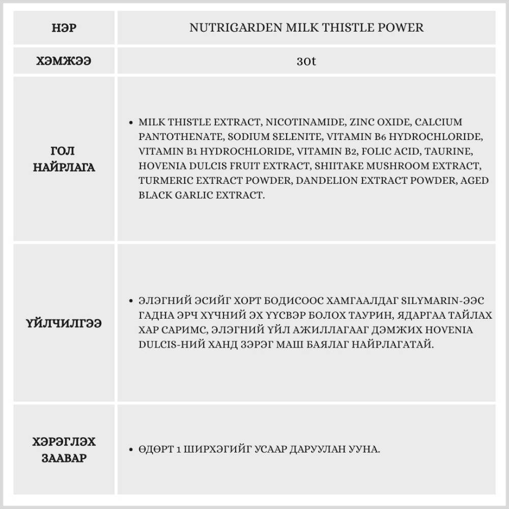 Энэхүү бүтээгдэхүүн нь АНУ-аас гаралтай өндөр чанартай Silymarin гол найрлагаа болгосон, элэгний үйл ажиллагааг дэмжих нэмэлт тэжээл юм. Элэг хамгаалах үйлчилгээг витамин болон уламжлалт эмийн ургамлын хандтай хослуулсан тул эрч хүч нөхөж , ядаргааг тайлна.