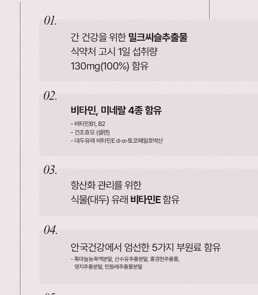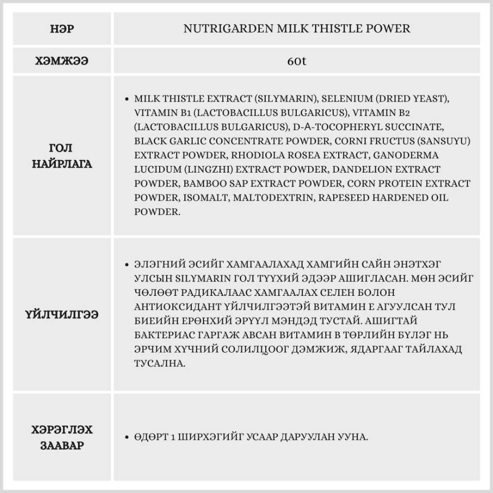 энэхүү бүтээгдэхүүн нь элэгний эрүүл мэндийг дэмжих Silymarin хандаас гадна биеийг исэлдэлтээс хамгаалах, эрч хүч нэмэгдүүлэх туслах найрлагатай. Ялангуяа ашигтай бактерийн өсгөвөр болон ургамлын ханднуудыг ашиглан элгийг хоргүйжүүлэх, нөхөн төлжих үйл ажиллагааг дэмжинэ.