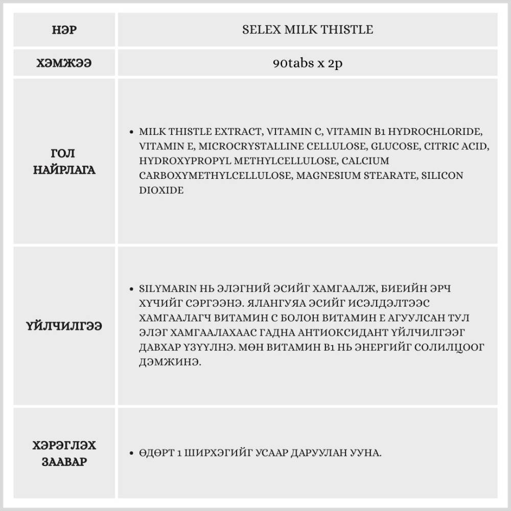 Элэгний эрүүл мэндийг дэмжих Silymarin хандыг Витамин B1, C, E-тэй хослуулсан үйлчилгээтэй нэмэлт тэжээл юм.