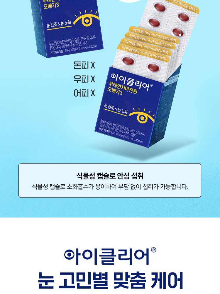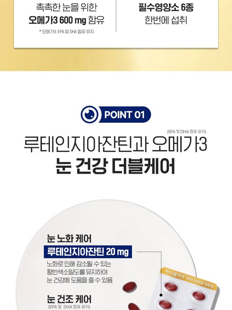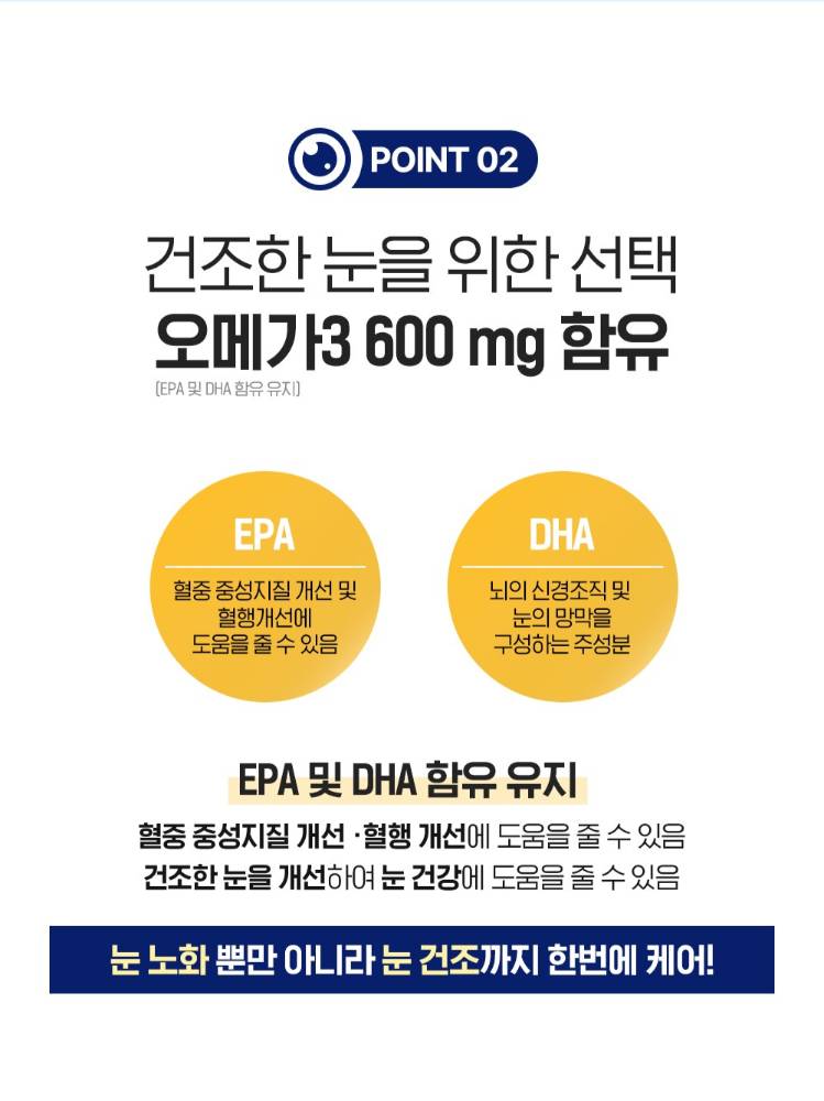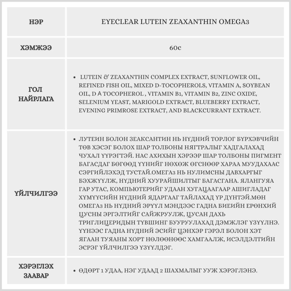 Энэхүү бүтээгдэхүүн нь 60 ширхэгтэй, 2 сарын хэрэглээг багтаасан бөгөөд лутеин, зеаксантин нь шар толбоны пигментийг нөхөж, нүдийг цэнхэр гэрэл болон хэт ягаан туяанаас хамгаална. Мөн Омега3 нь нулимсны давхаргыг бэхжүүлж, компьютер, гар утаснаас үүдэлтэй нүдний хуурайшилт, ядаргааг багасгана.