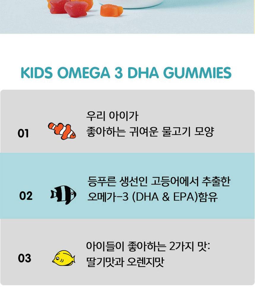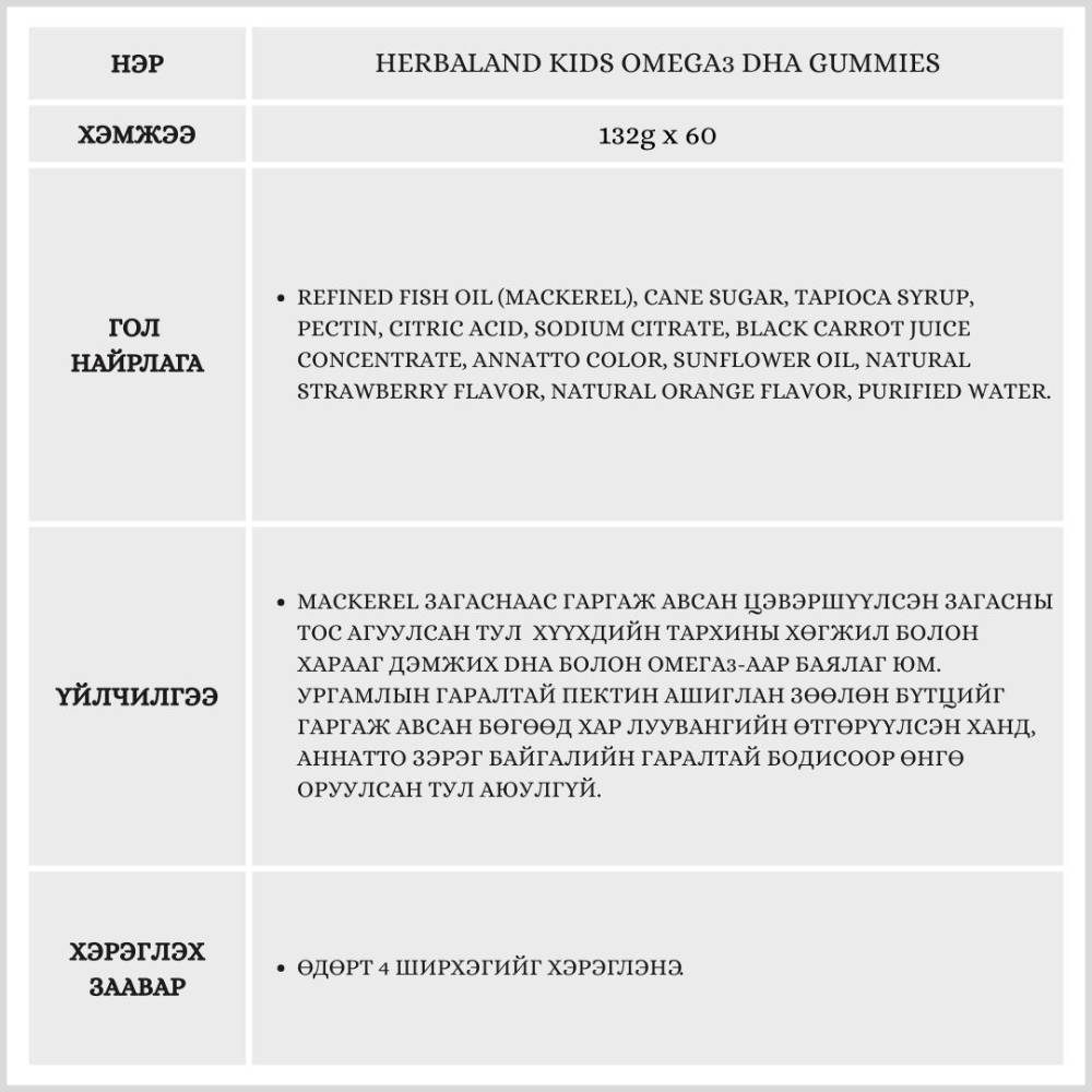 Хүүхдүүдэд шаардлагатай шим тэжээлийг амттай зажилдаг желли хэлбэртэй хүүхдийн омега3 юм. Чихрийн нишингэ болон тапиока сиропоор эрүүл мэндэд тустай чихэрлэг амтыг гаргаж, байгалийн гүзээлзгэнэ болон жүржийн үнэрээр баяжуулсан.