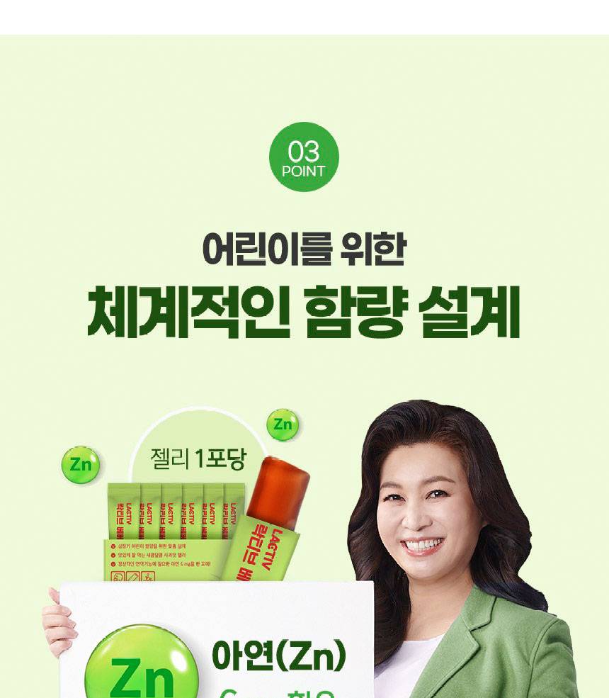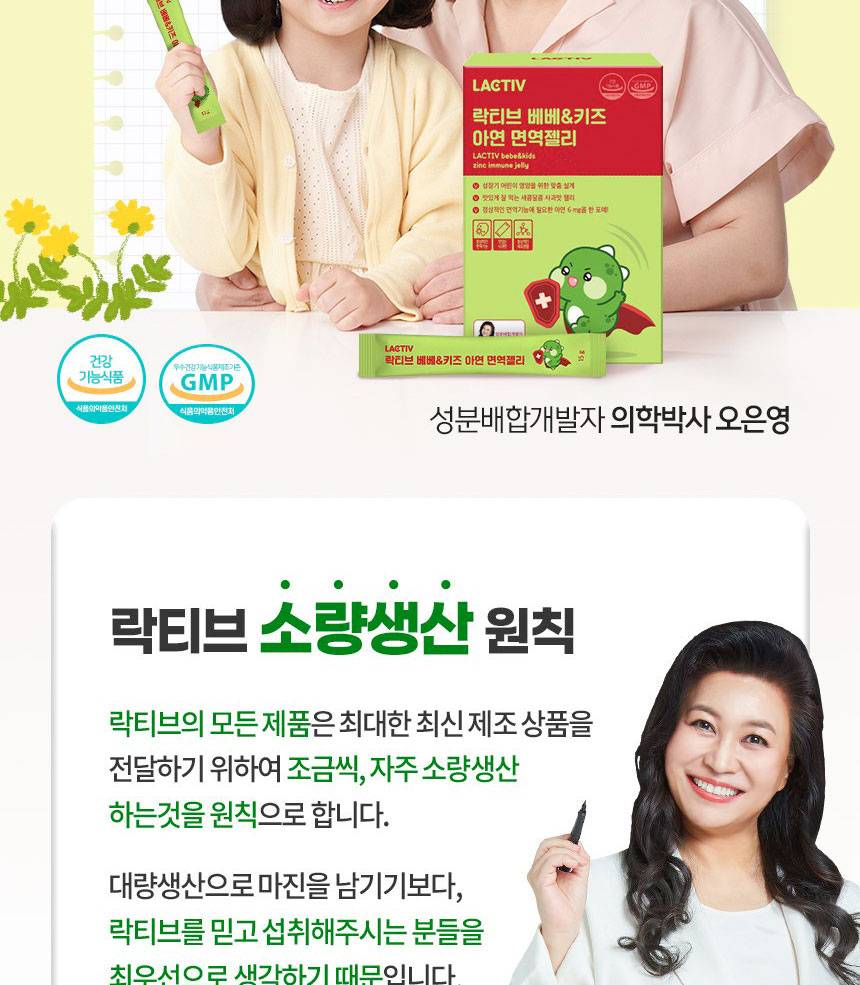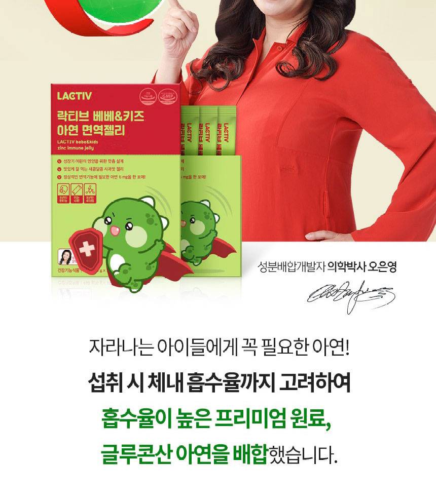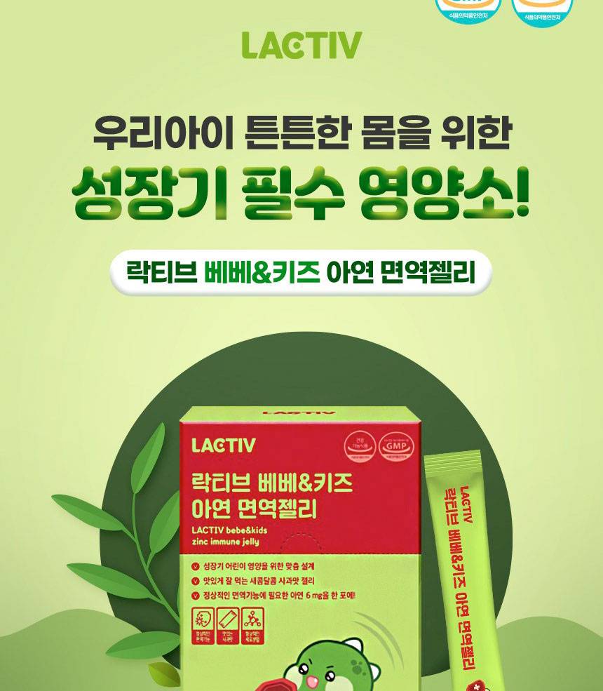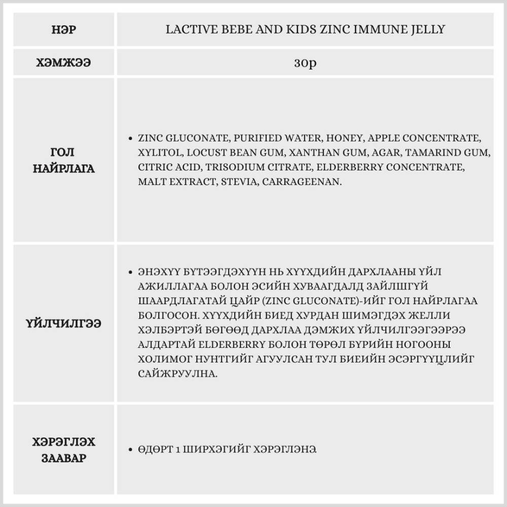 Lactive Bebe & Kids Zinc Immune Jelly нь хүүхдийн дархлааны системийг дэмжих зорилгоор тусгайлан гаргаж авсан, алимны амттай зажилдаг желли хэлбэрийн нэмэлт тэжээл юм.