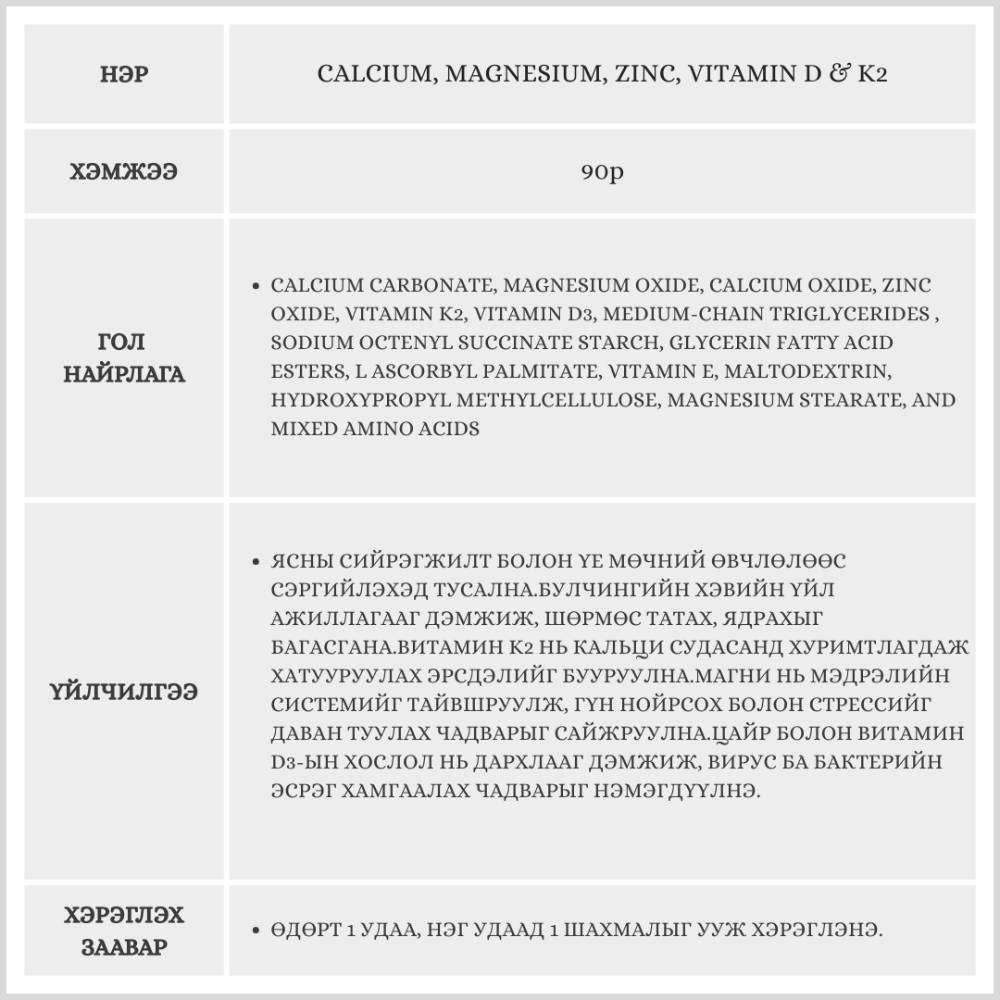 Яс, шүдийг бэхжүүлж, ясны сийрэгжилтээс сэргийлэхэд дэмжлэг үзүүлнэ.Булчингийн хэвийн үйл ажиллагааг хангаж, шөрмөс татах, ядаргааг багасгана.Витамин K2 нь кальцийг ясанд зөв шингээж, судасанд хуримтлагдах эрсдэлийг бууруулна.