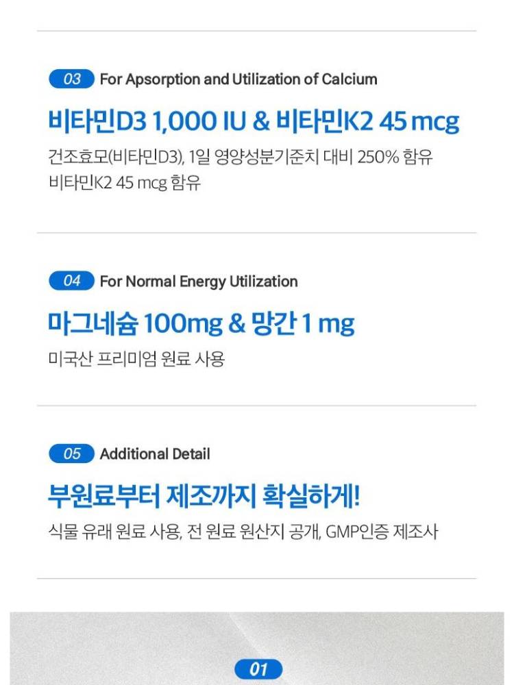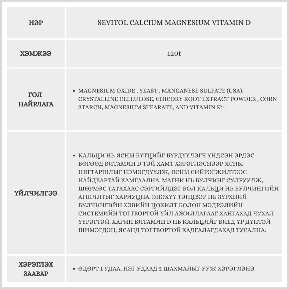 Энэхүү витамин нь хайрцагтаа 120 ширхэгтэй бөгөөд 2 сарын хэрэглээг багтаасан. Кальци нь ясны бүтцийг бүрдүүлэгч үндсэн эрдэс бөгөөд витамин D тэй хамт хэрэглэснээр ясны нягтаршлыг нэмэгдүүлж, ясны сийрэгжилтээс найдвартай хамгаална.
