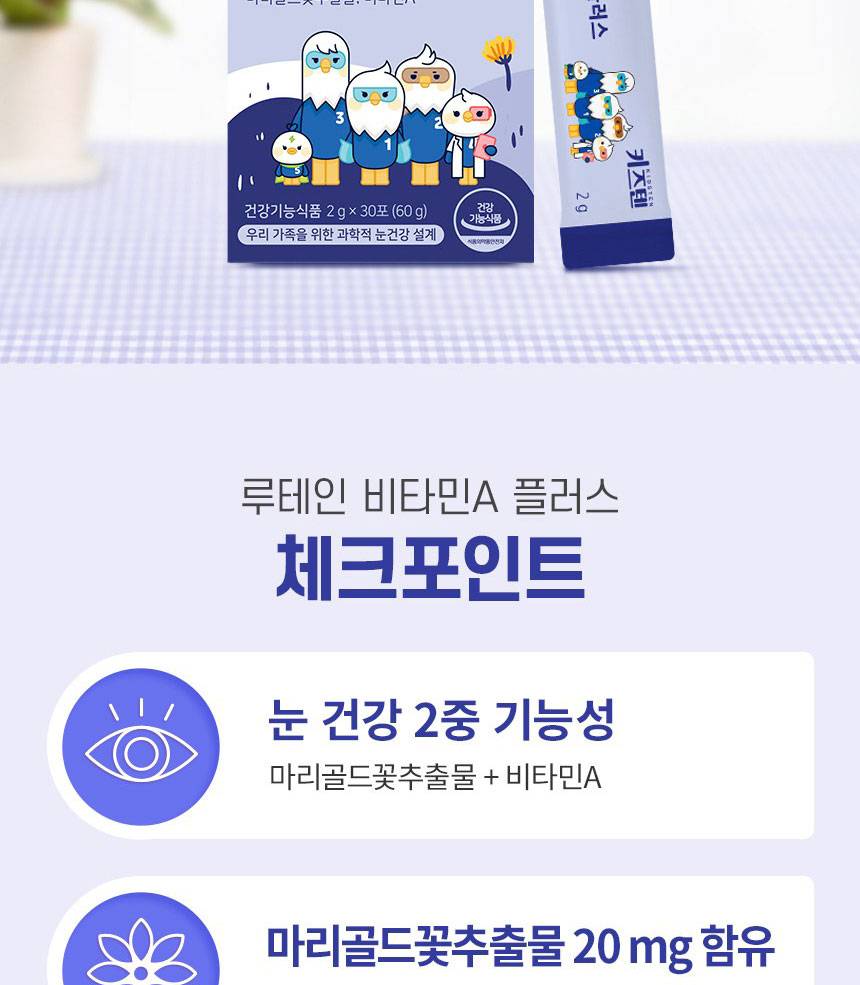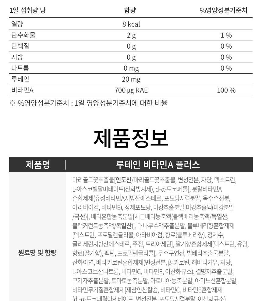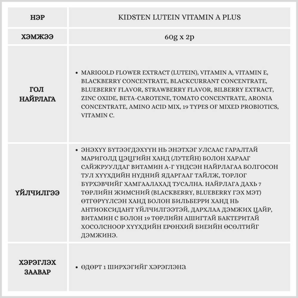 Энэхүү бүтээгдэхүүн нь нүдний эрүүл мэндэд нэн чухал лутейн болон Витамин А-гээр баялаг жимсний хандтай хослуулснаараа онцлог юм.