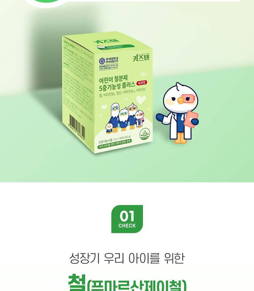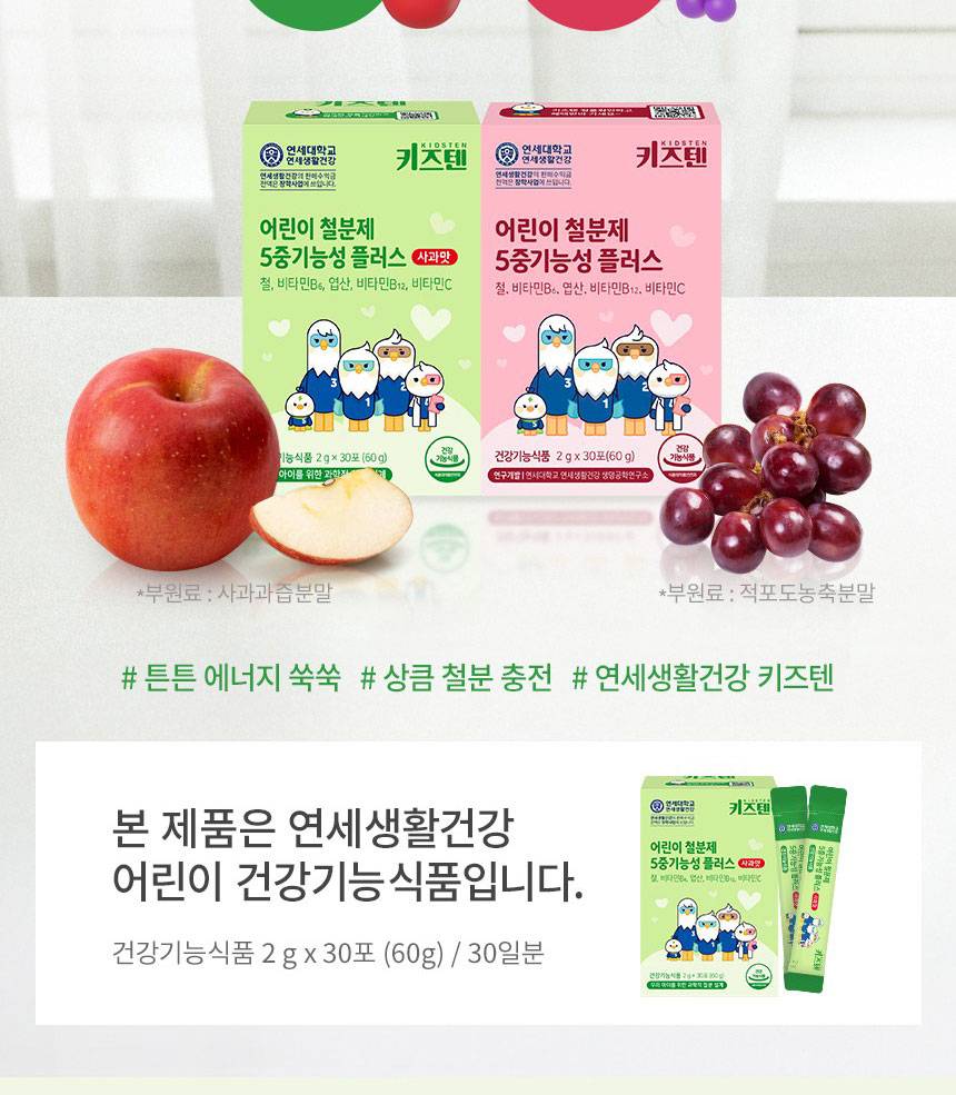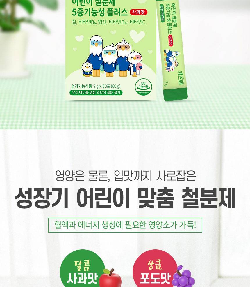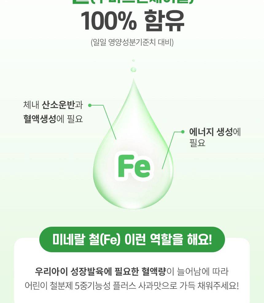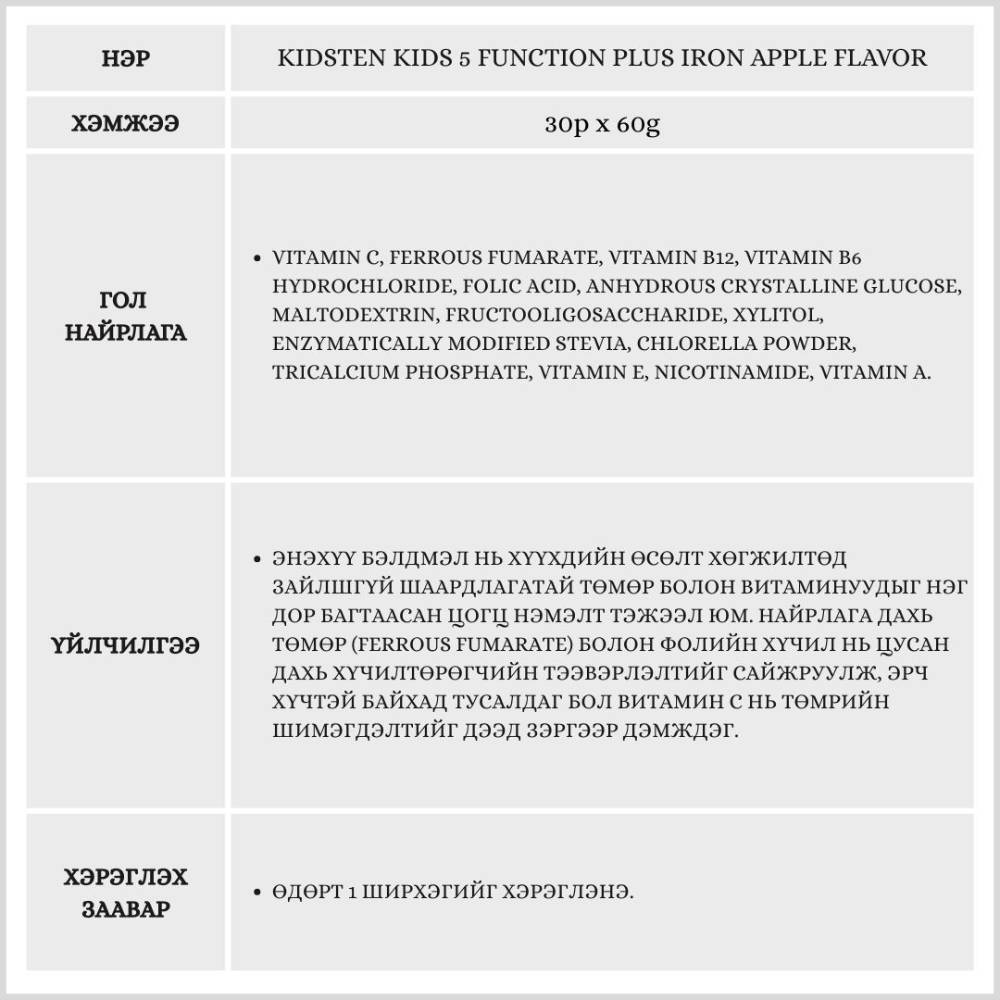 Өсөлт хөгжилтийн шатандаа яваа хүүхдүүдийн цус төлжилтийг дэмжиж, эрч хүчийг нэмэгдүүлэх үйлчилгээтэй 5 төрлийн үндсэн үйлдэлтэй нэмэлт тэжээл юм. Төмрийн бэлдмэлийн өвөрмөц амтыг ногоон алимны сэргэг амтаар сольж, хүүхэд зажилж идэхэд тохиромжтой хэлбэрээр хийгдсэн.
