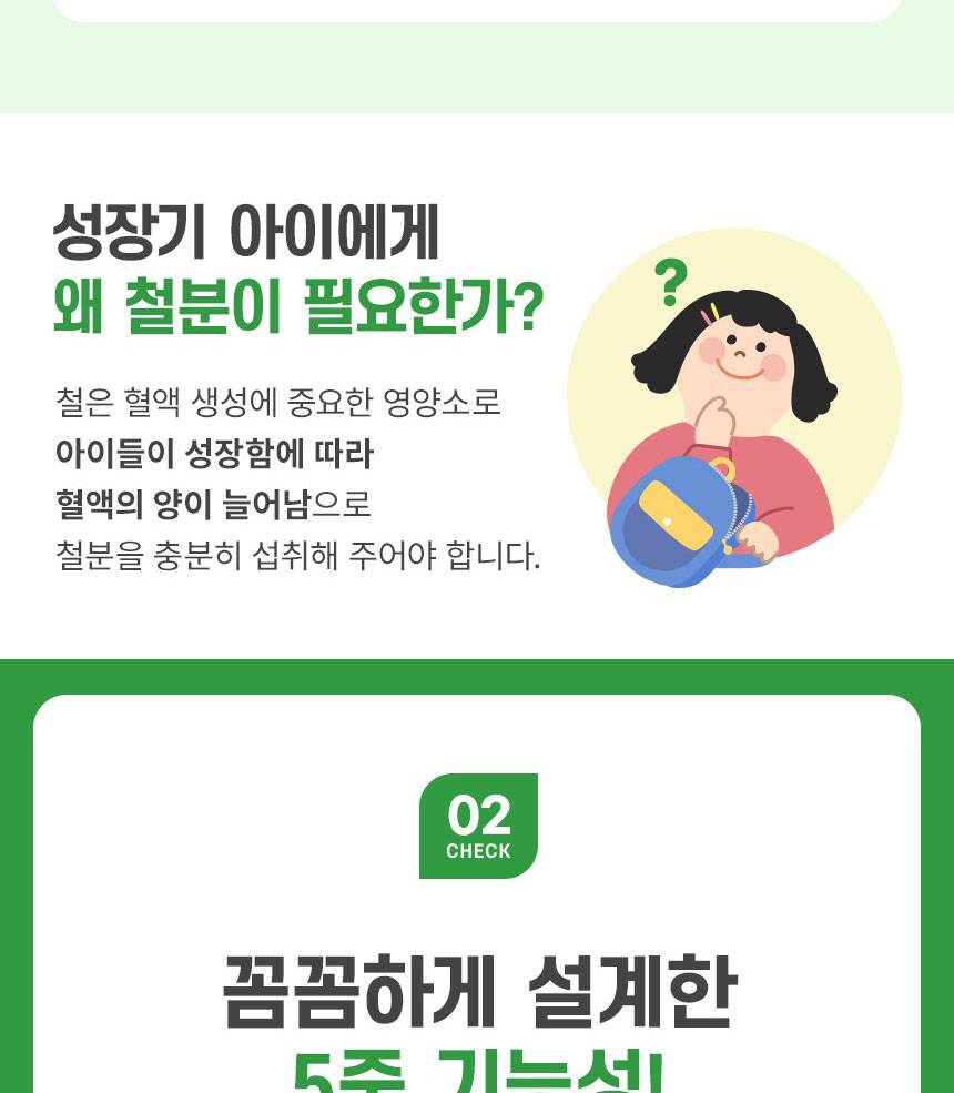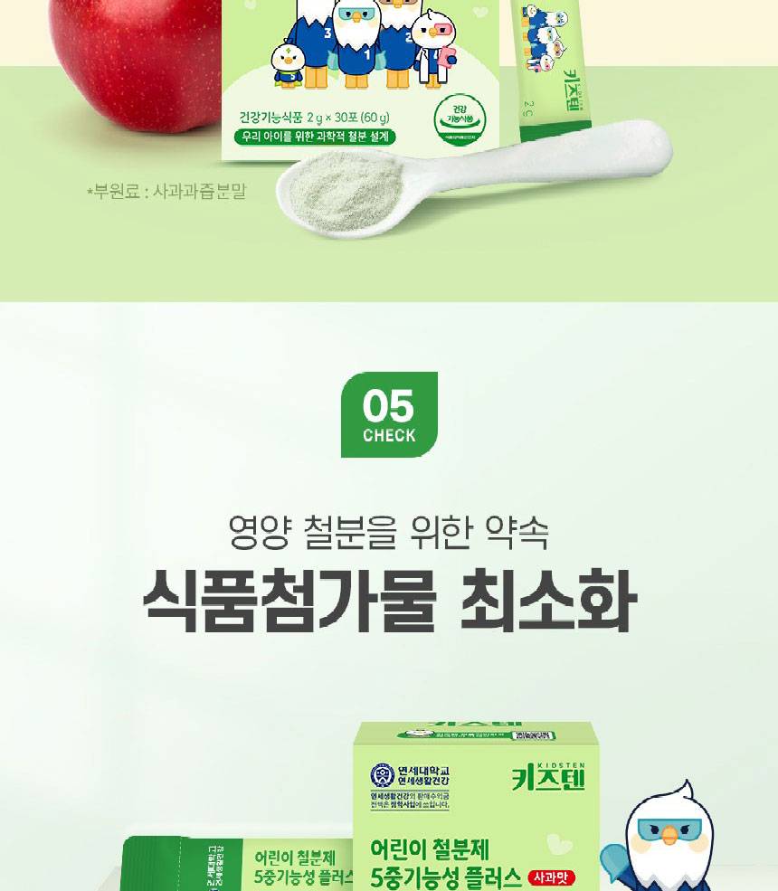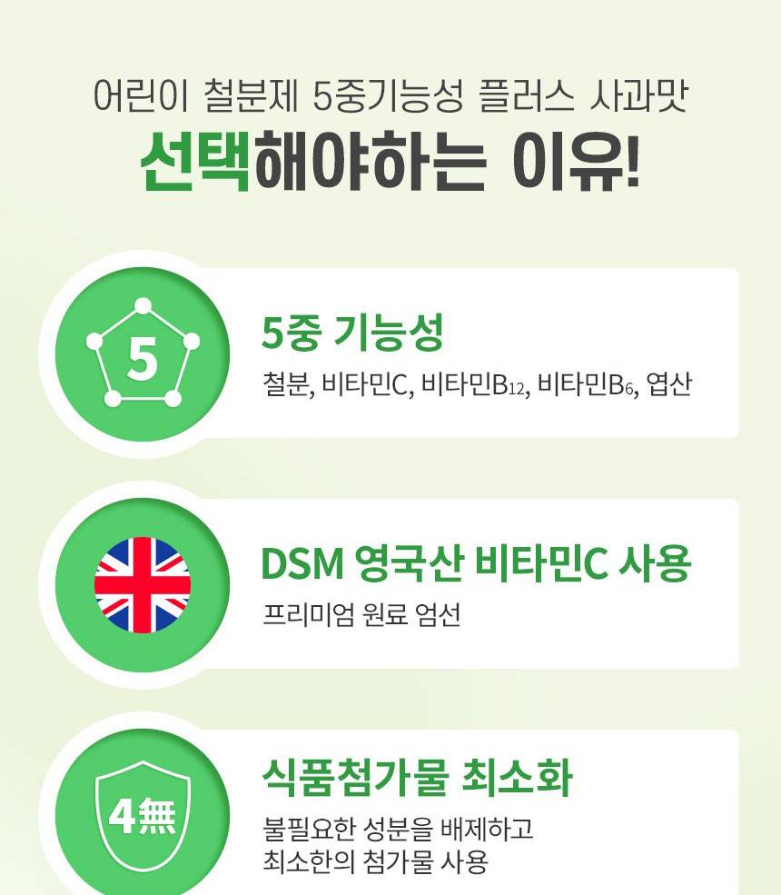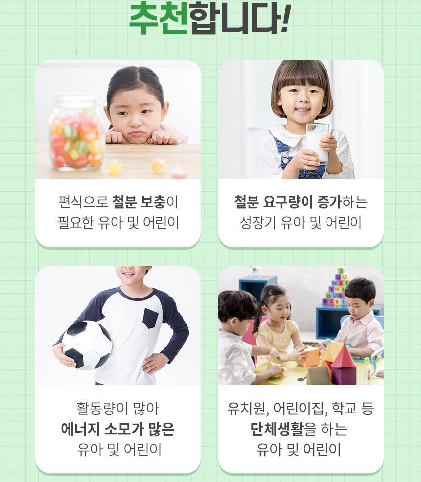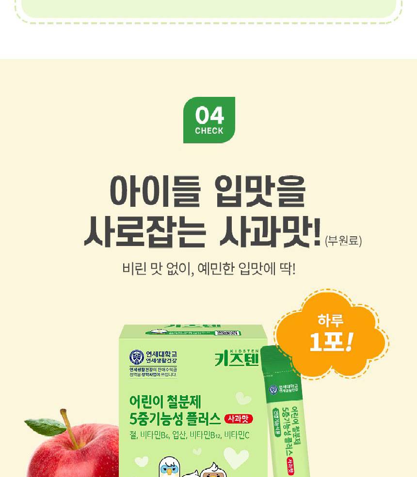 Өсөлт хөгжилтийн шатандаа яваа хүүхдүүдийн цус төлжилтийг дэмжиж, эрч хүчийг нэмэгдүүлэх үйлчилгээтэй 5 төрлийн үндсэн үйлдэлтэй нэмэлт тэжээл юм. Төмрийн бэлдмэлийн өвөрмөц амтыг ногоон алимны сэргэг амтаар сольж, хүүхэд зажилж идэхэд тохиромжтой хэлбэрээр хийгдсэн.