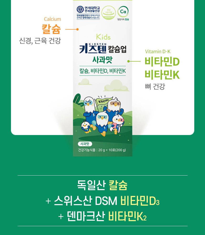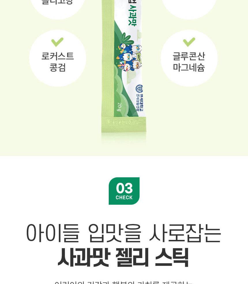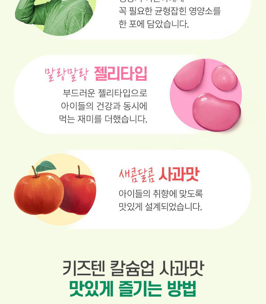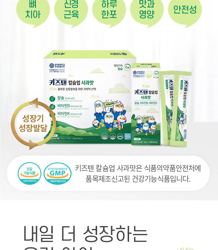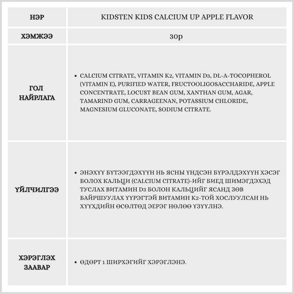 Өсөлт хөгжилтийн чухал үе шатанд байгаа хүүхдүүдийн яс болон шүдийг бэхжүүлэх үйлчилгээтэй, алимны амттай желли хэлбэрийн нэмэлт тэжээл юм. Кальцийн шимэгдэлтийг дэмжих витаминуудыг агуулсан.