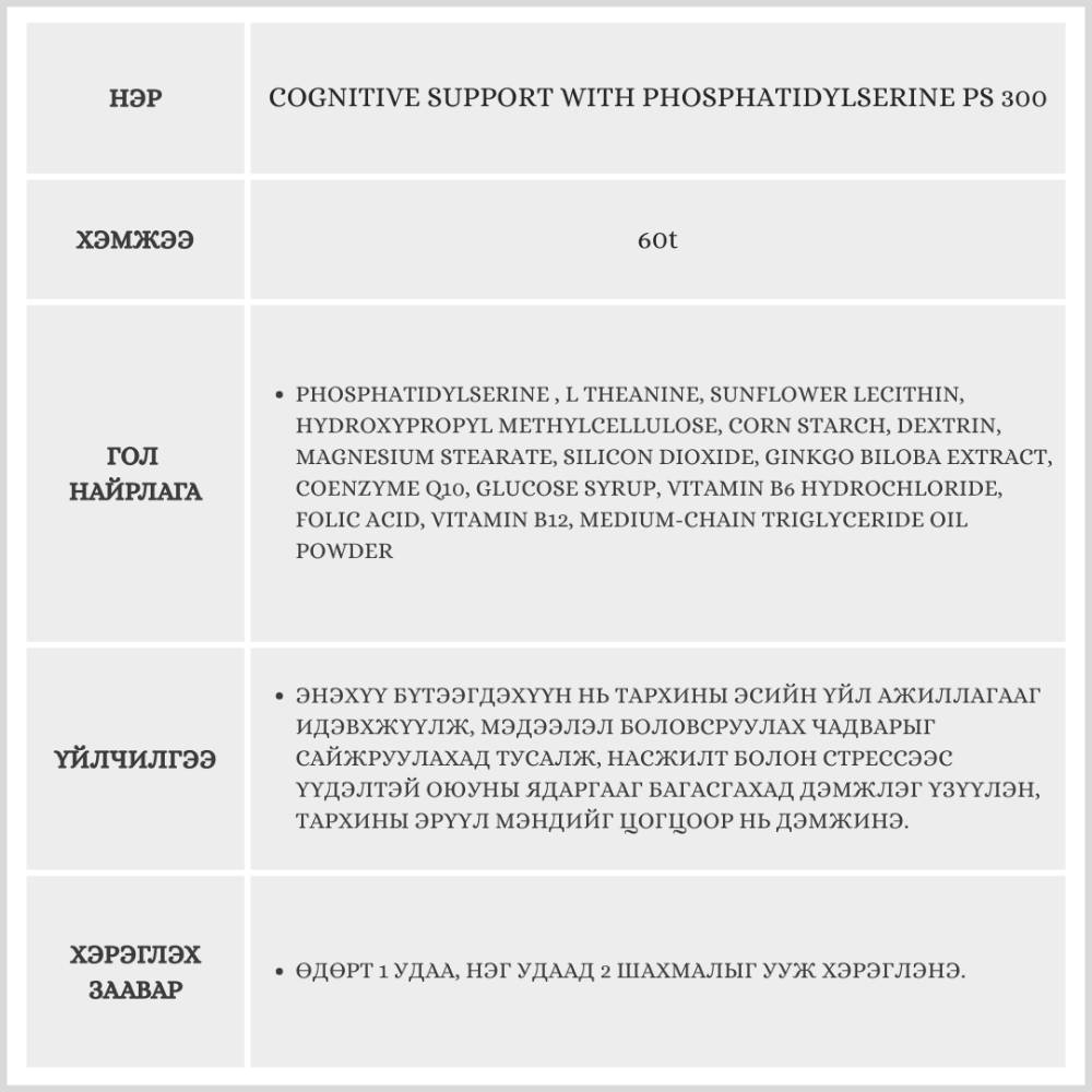 Энэхүү бүтээгдэхүүн нь хайрцагтаа 60 ширхэгтэй, 2сарын хэрэглээг агуулсан бөгөөд ой тогтоолт, анхаарал төвлөрөл, танин мэдэхүйн үйл ажиллагааг дэмжинэ.