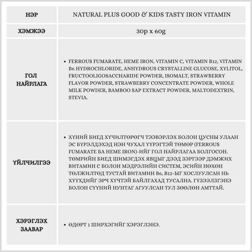 Өсөлт хөгжилтийн шатандаа яваа хүүхдүүдийн цус төлжилтийг дэмжих, төмрийн хэрэгцээг нь амттай аргаар нөхөх үйлчилгээтэй бүтээгдэхүүн юм.