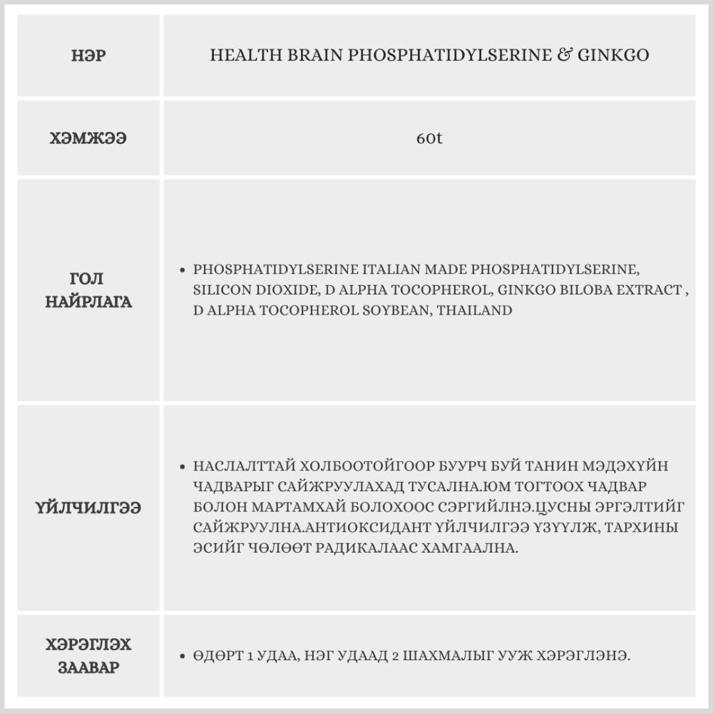 Зөвхөн ой тогтоолтыг дэмжихээс гадна тархины цусны эргэлтийг давхар сайжруулж, нас ахих тусам бие махбодод дутагддаг тархины чухал нэгдлүүдийг нөхөхөд зориулагдсан тэжээл.