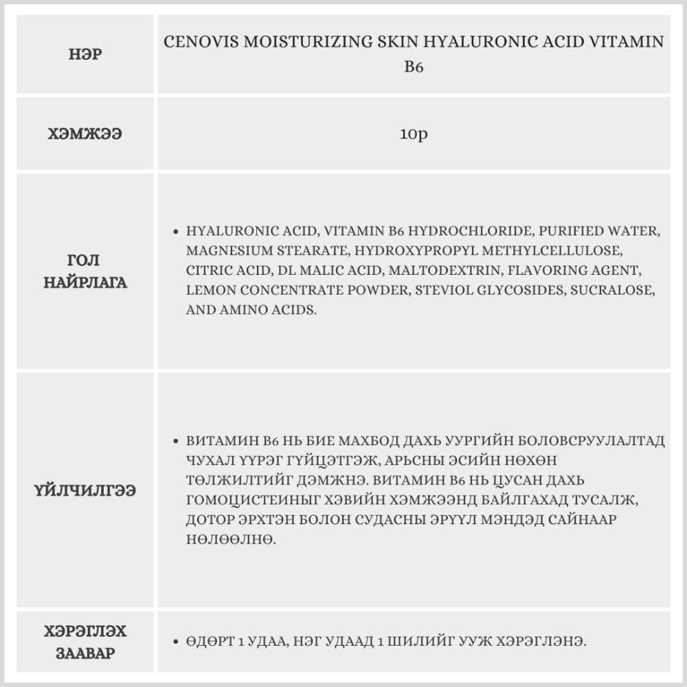 Энэхүү бүтээгдэхүүн нь хиалуроны хүчил агуулсан тул арьсны чийгшлийг гүн нөхөж, хуурайшилтыг багасгана. Витамин B6 нь арьсны бодисын солилцоог дэмжиж, арьс эрүүл, тэнцвэртэй байхад тусална.