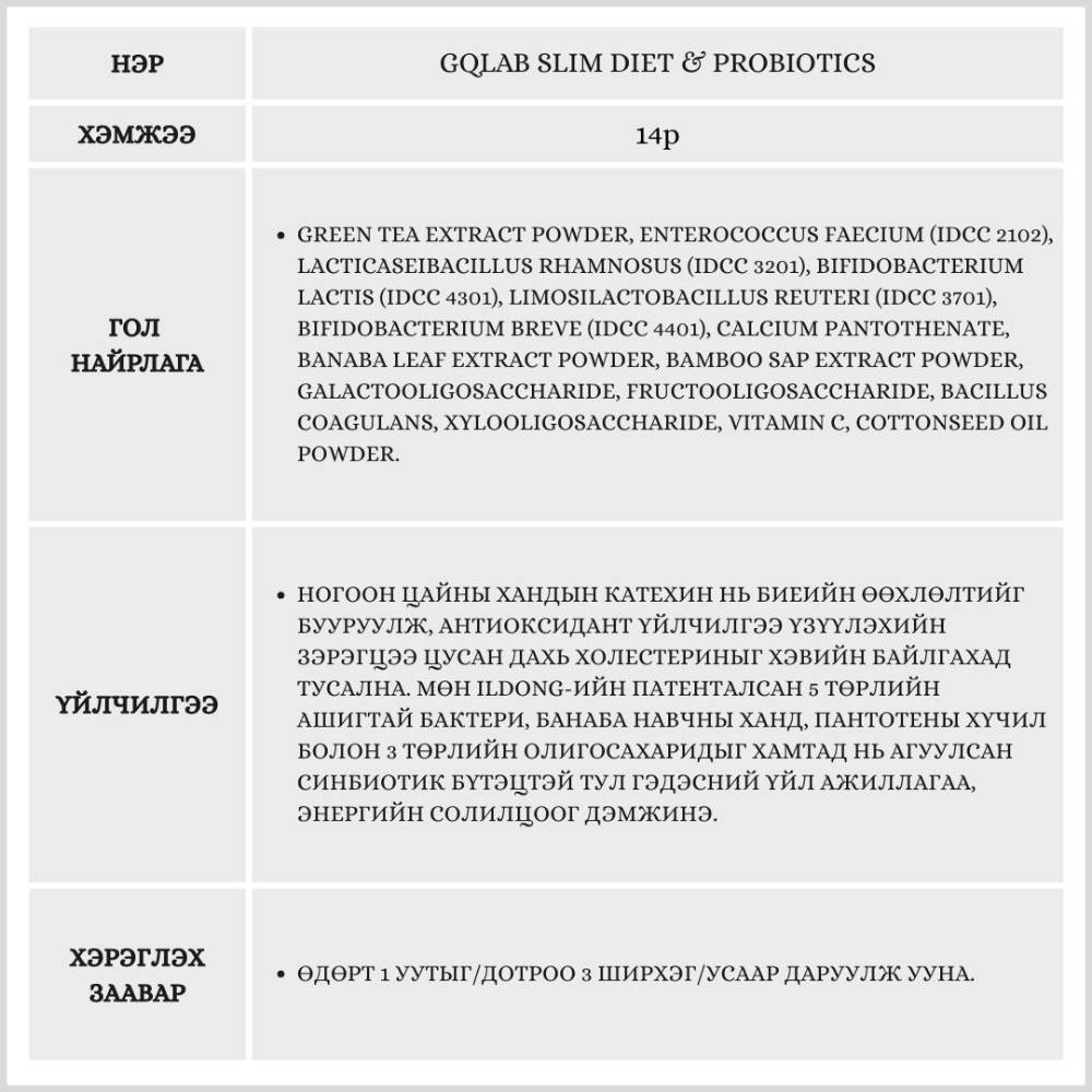 Биеийн өөхлөлтийг бууруулах үйлчилгээтэй ногоон цайны ханд болон гэдэсний эрүүл мэндийг дэмжих ашигтай бактериудыг хослуулсан бүтээгдэхүүн юм.