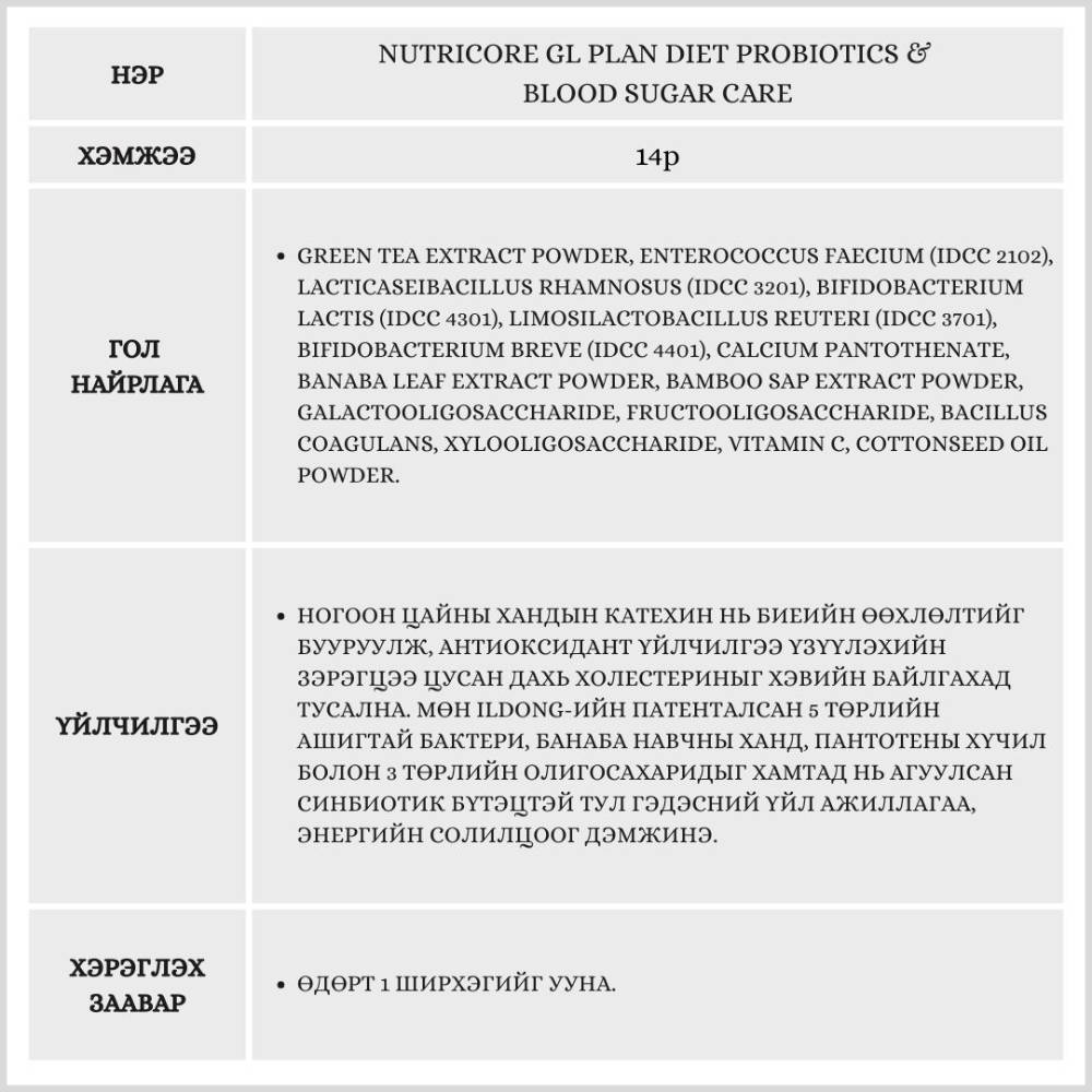 Биеийн жинг бууруулах, цусан дахь сахарын хэмжээг хянах болон гэдэсний гүрвэлзэх хөдөлгөөнийг дэмжих 3 төрлийн үйлчилгээтэй бүтээгдэхүүн юм.