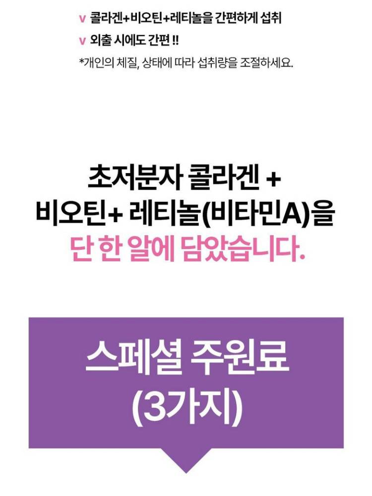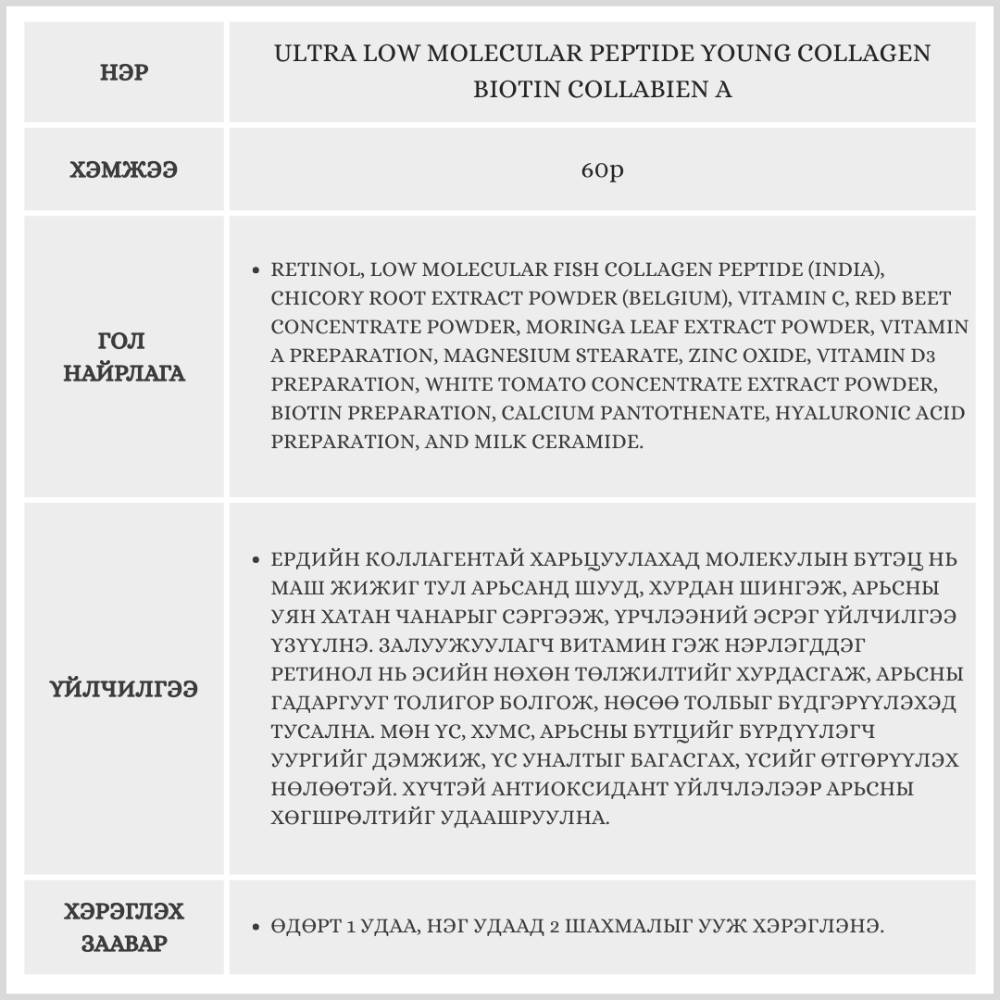 Энэхүү бүтээгдэхүүн нь арьс арчилгаанд хамгийн хүчтэйд тооцогдох хоёр найрлага болох коллаген болон ретинолыг нэг дор багтаасан, арьсны уян хатан байдал, нөхөн төлжилтийг дотроос нь дэмжих өндөр үр дүнтэй Inner Beauty нэмэлт тэжээл юм.