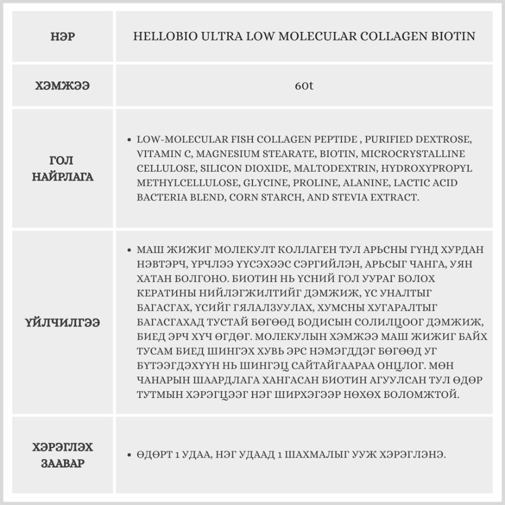 Энэхүү бүтээгдэхүүн нь 60 ширхэгтэй бөгөөд 2 сарын хэрэглээг агуулсан. Арьсны уян хатан чанарыг дэмжиж, үс болон хумсыг бэхжүүлэн, бодисын солилцоог сайжруулахад тусална.