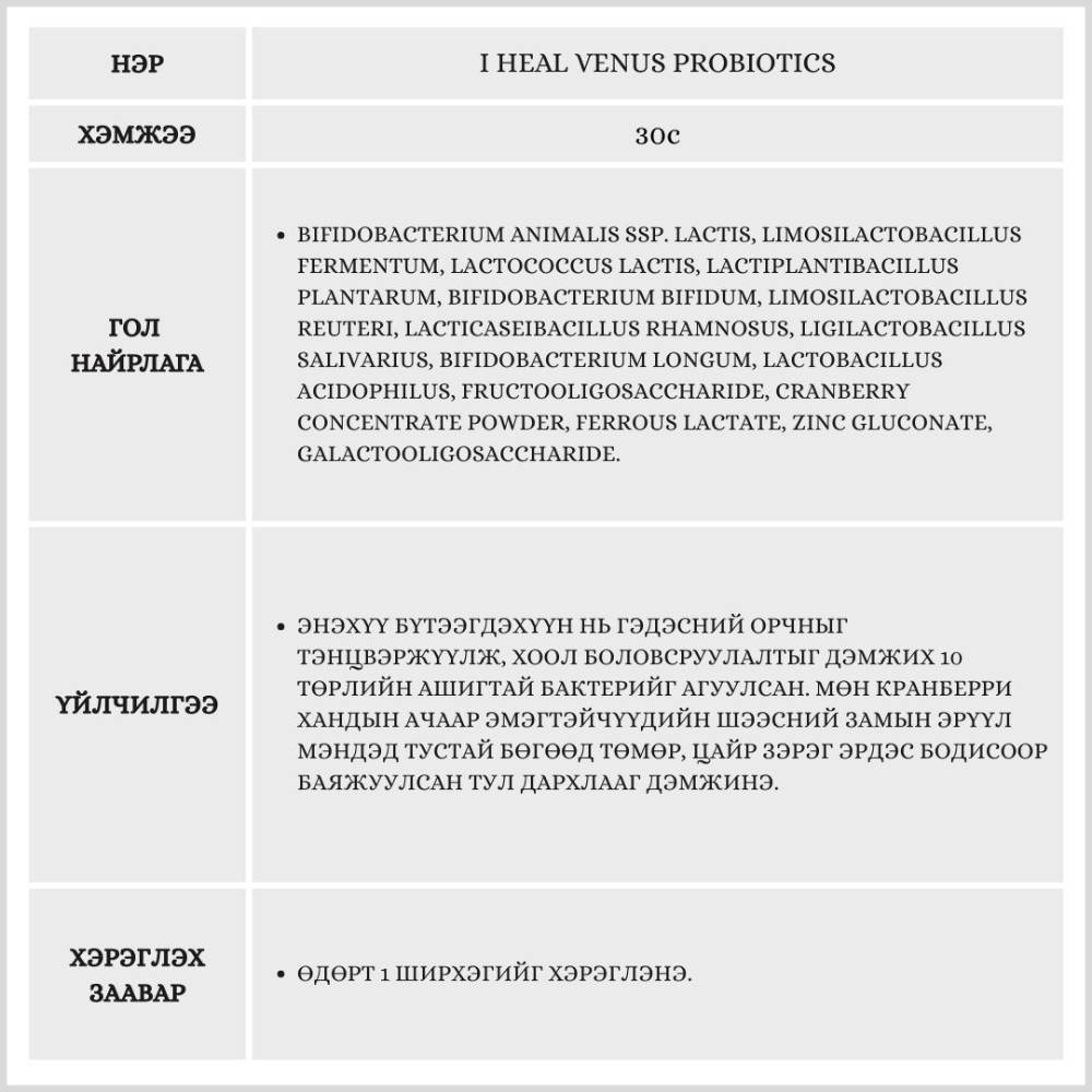 Эмэгтэйчүүдийн эрүүл мэнд болон гэдэсний үйл ажиллагааг дэмжих үйлчилгээтэй, 10 төрлийн ашигтай бактерийн холимог агуулсан бүтээгдэхүүн юм. Эмэгтэй хүний биеийн онцлогт тохируулан сонгосон эдгээр бактериуд нь дархлааг дэмжих эрдэс бодисоор баяжуулсан.