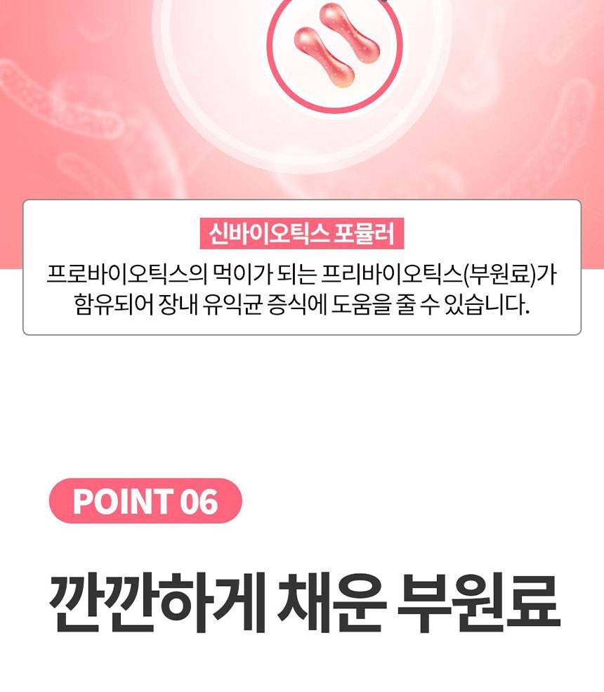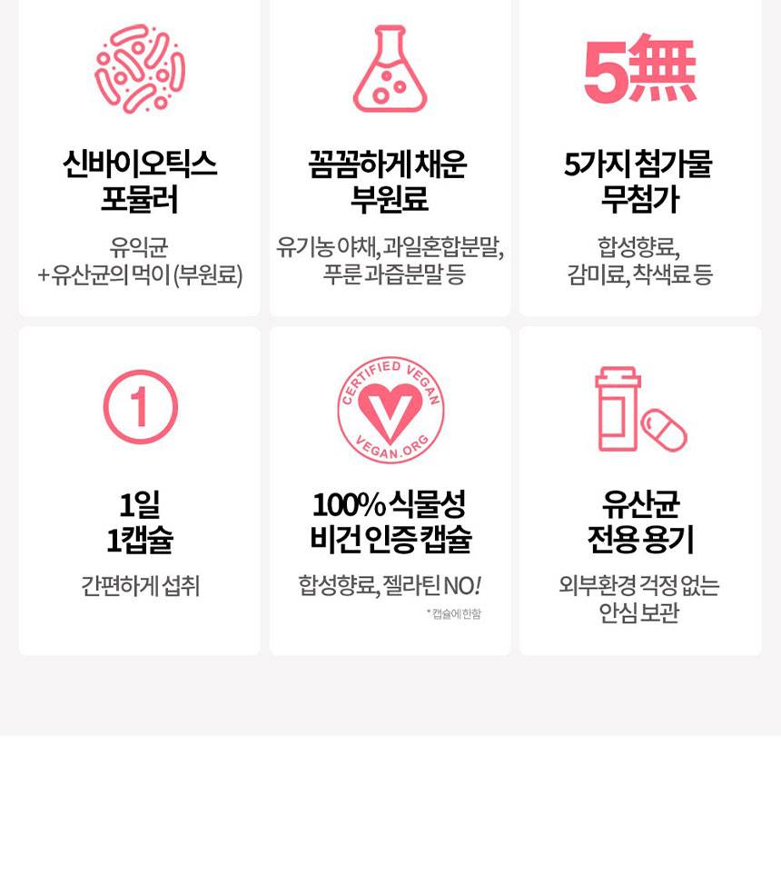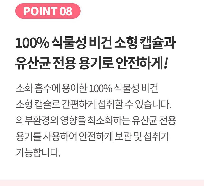 5 тэрбум CFU баталгаажсан ашигтай бактери агуулсан бүтээгдэхүүн юм. Эмэгтэй хүний биеийн онцлогт тохирсон ашигтай бактериудыг нарийн тооцоолсон бөгөөд ургамлын гаралтай капсул ашигласан тул ходоод гэдсийг хямраахгүй.