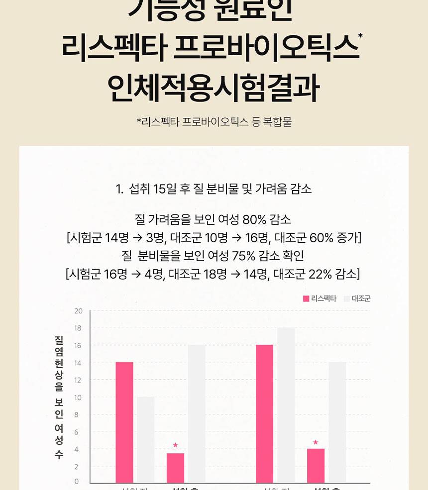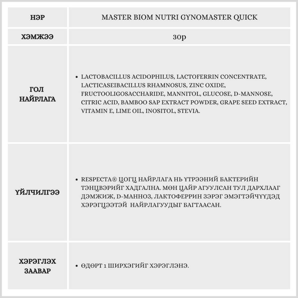 Энэхүү бүтээгдэхүүн нь эмэгтэйчүүдийн үтрээний эрүүл мэнд болон гэдэсний үйл ажиллагааг хамтад нь дэмжих үйлчилгээтэй. Respecta® хэмээх тусгай найрлагыг агуулсан тул үтрээний ашигтай бактерийг нэмэгдүүлж, таагүй мэдрэмжийг багасгана.