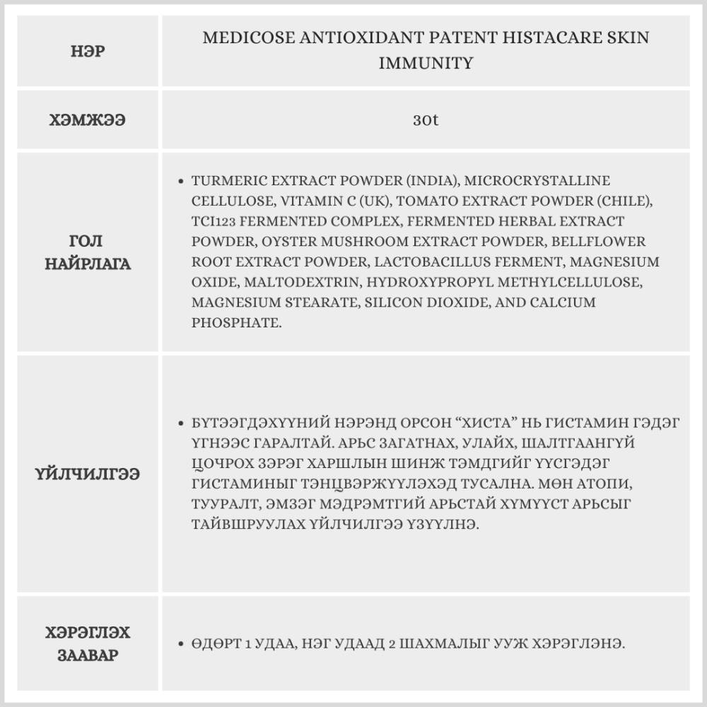 Энэхүү бүтээгдэхүүн нь 30 ширхэгтэй бөгөөд 15 хоногийн хэрэглээг агуулсан. Арьсны гаднах хамгаалалтын давхаргыг бэхжүүлж, гадны нян, бохирдол, цочролд тэсвэртэй болгоно. Мөн эсийн түвшинд арьсыг хамгаалж, үрэвслийг дарах, хөгшрөлтийг удаашруулахад тусална.
