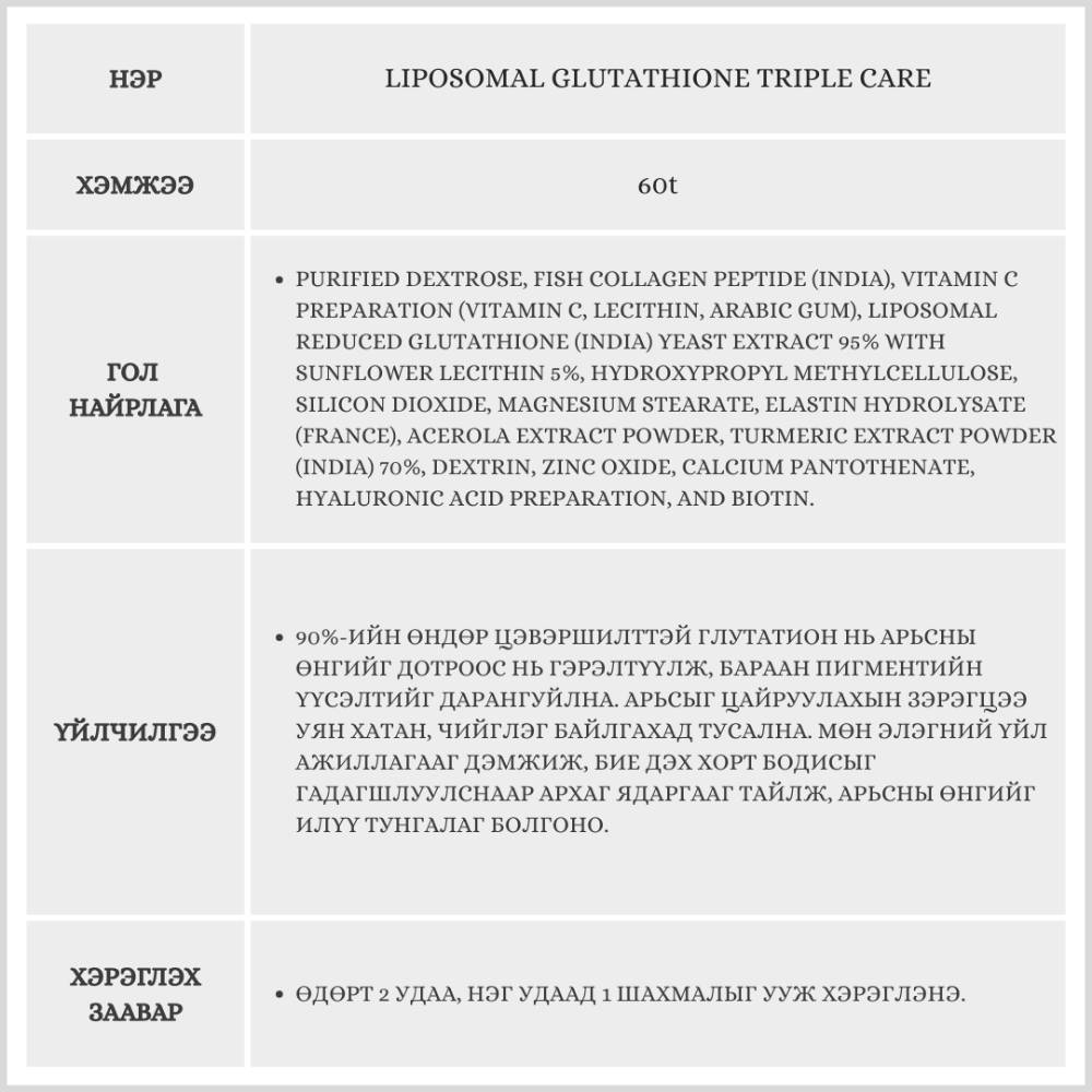 Энэхүү бүтээгдэхүүн нь хайрцагтаа 60 ширхэгтэй бөгөөд 1 сарын хэрэглээг агуулсан. Арьсыг дотроос нь цайруулан, нөсөө толбыг бүдгэрүүлэн, биеийн ерөнхий антиоксидант хамгаалалтыг дэмжинэ.