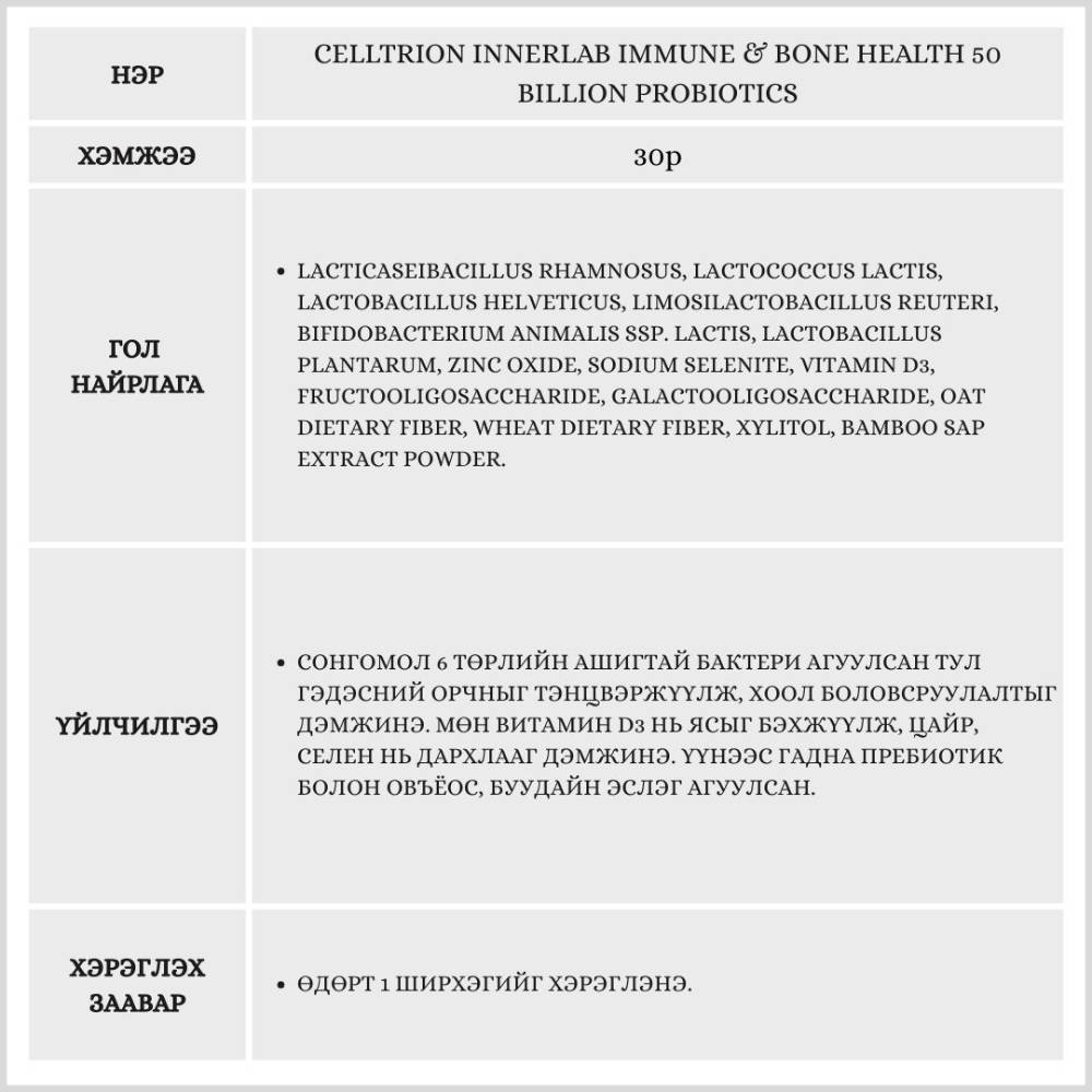 Энэхүү бүтээгдэхүүн нь ходоод гэдэс, дархлаа болон ясны бат бөх байдлыг дэмжих 3 төрлийн үйлчилгээтэй нэмэлт тэжээл бөгөөд 5 тэрбум ашигтай бактерийг агуулсан.