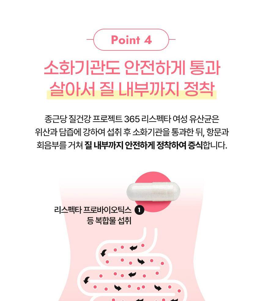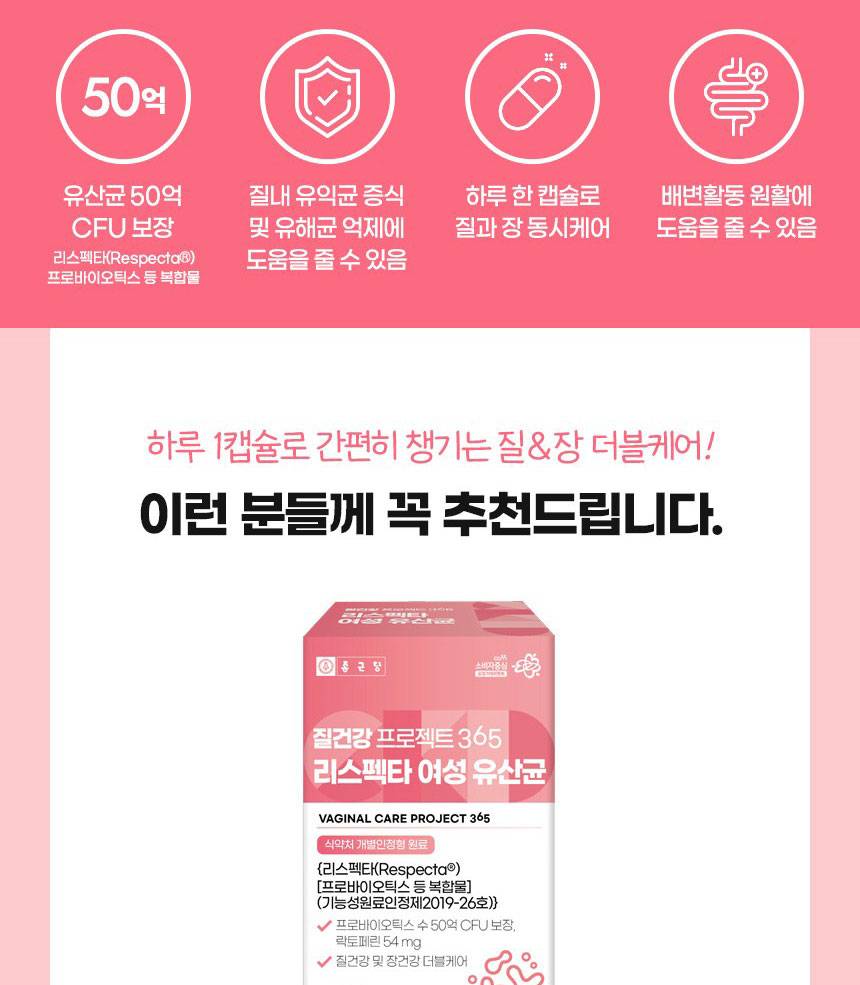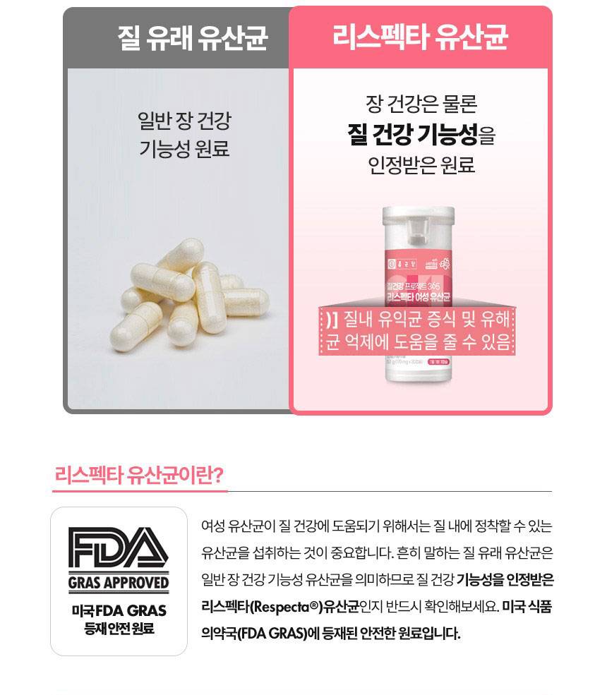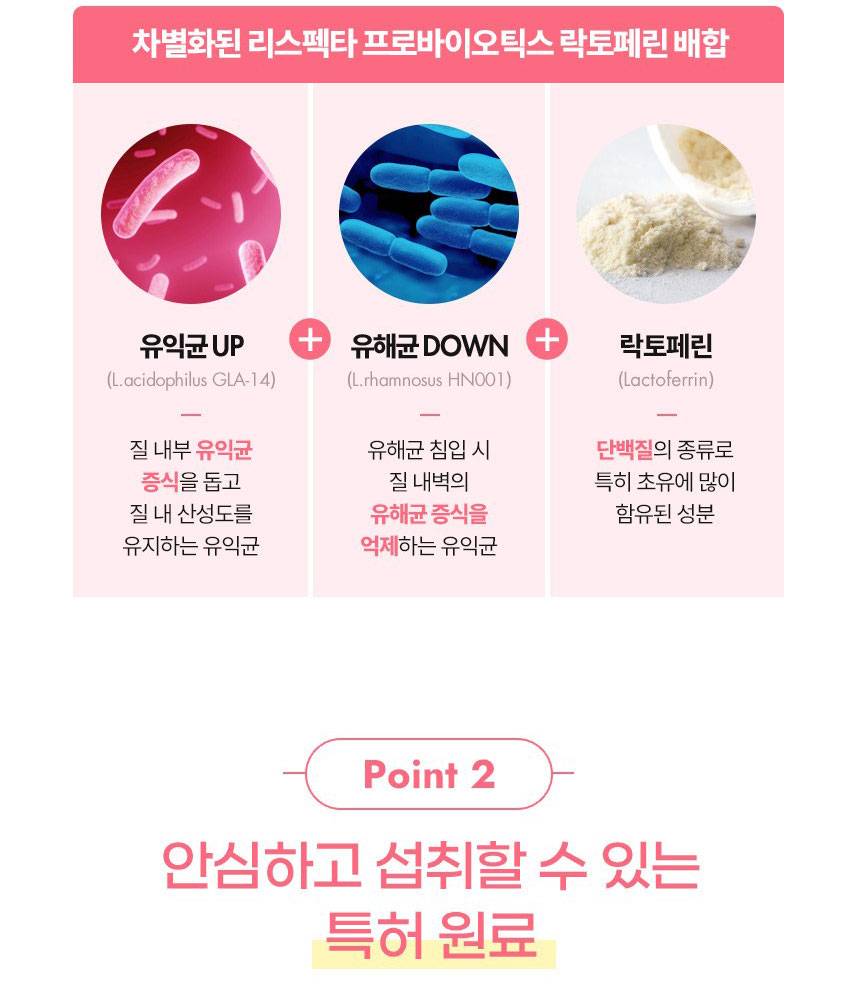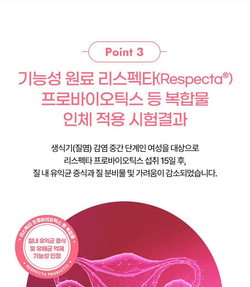 Энэхүү бүтээгдэхүүн нь эмэгтэйчүүдийн үтрээний эрүүл мэндэд зориулсан найрлага болох Respecta®-г гол найрлагаа болгосон. Үтрээний ашигтай бактерийг нэмэгдүүлж, хортой бактерийг дарангуйлах үйлчилгээтэй бөгөөд гэдэсний үйл ажиллагааг давхар дэмжинэ.