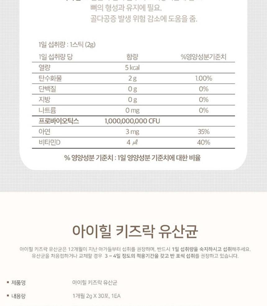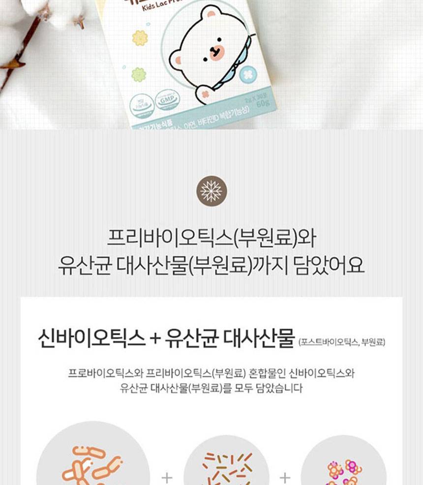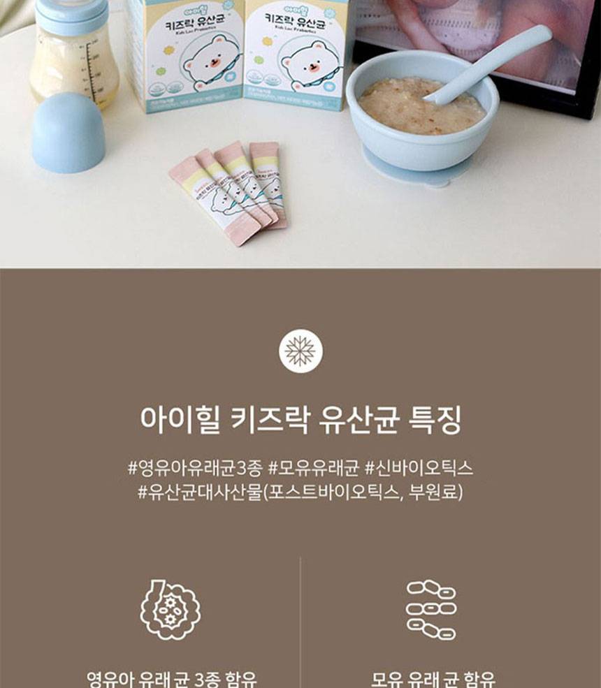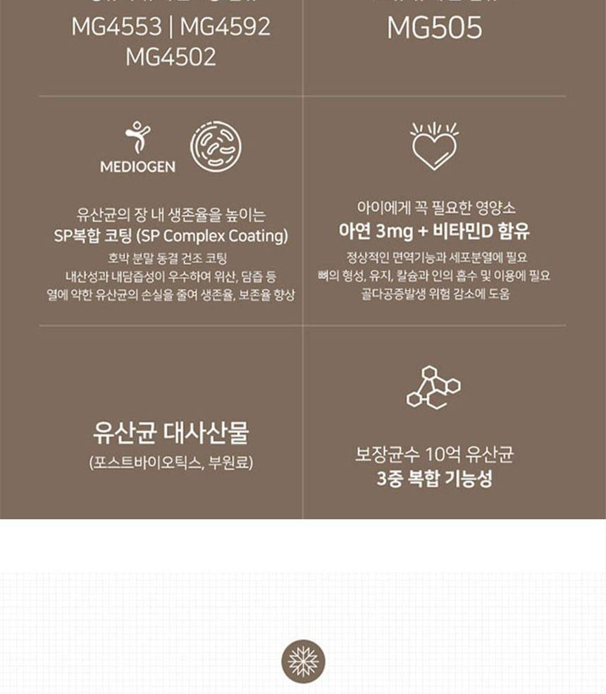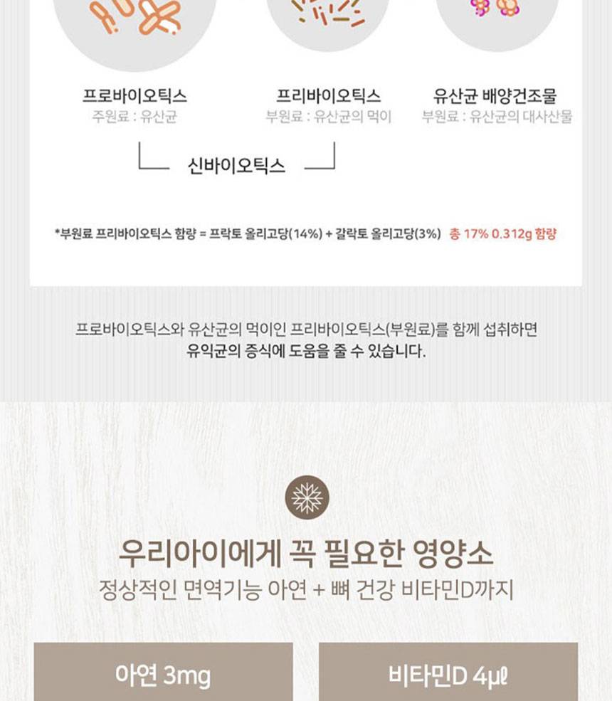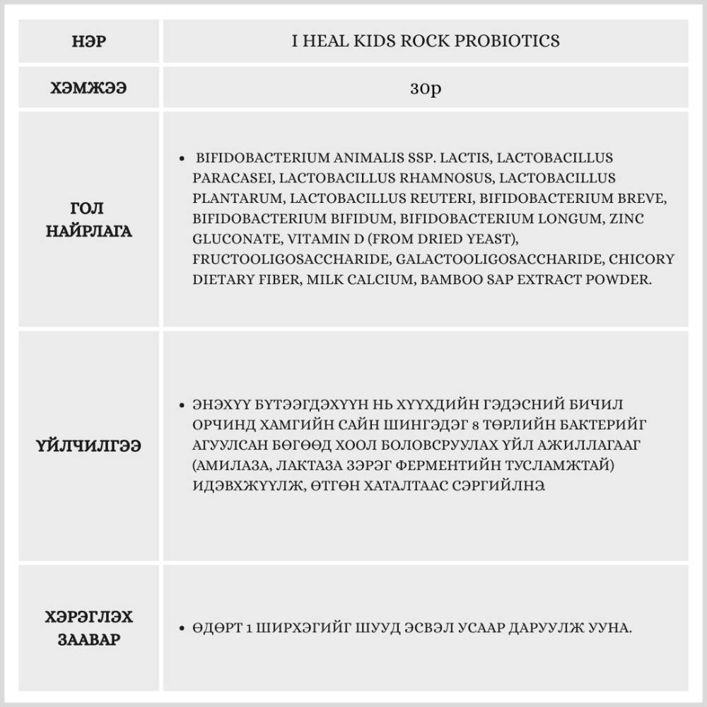 Хүүхдийн гэдэс, яс, дархлааг дэмжих үйлчилгээтэй бүтээгдэхүүн бөгөөд ашигтай бактер, цайр, витамин D-г агуулсан.