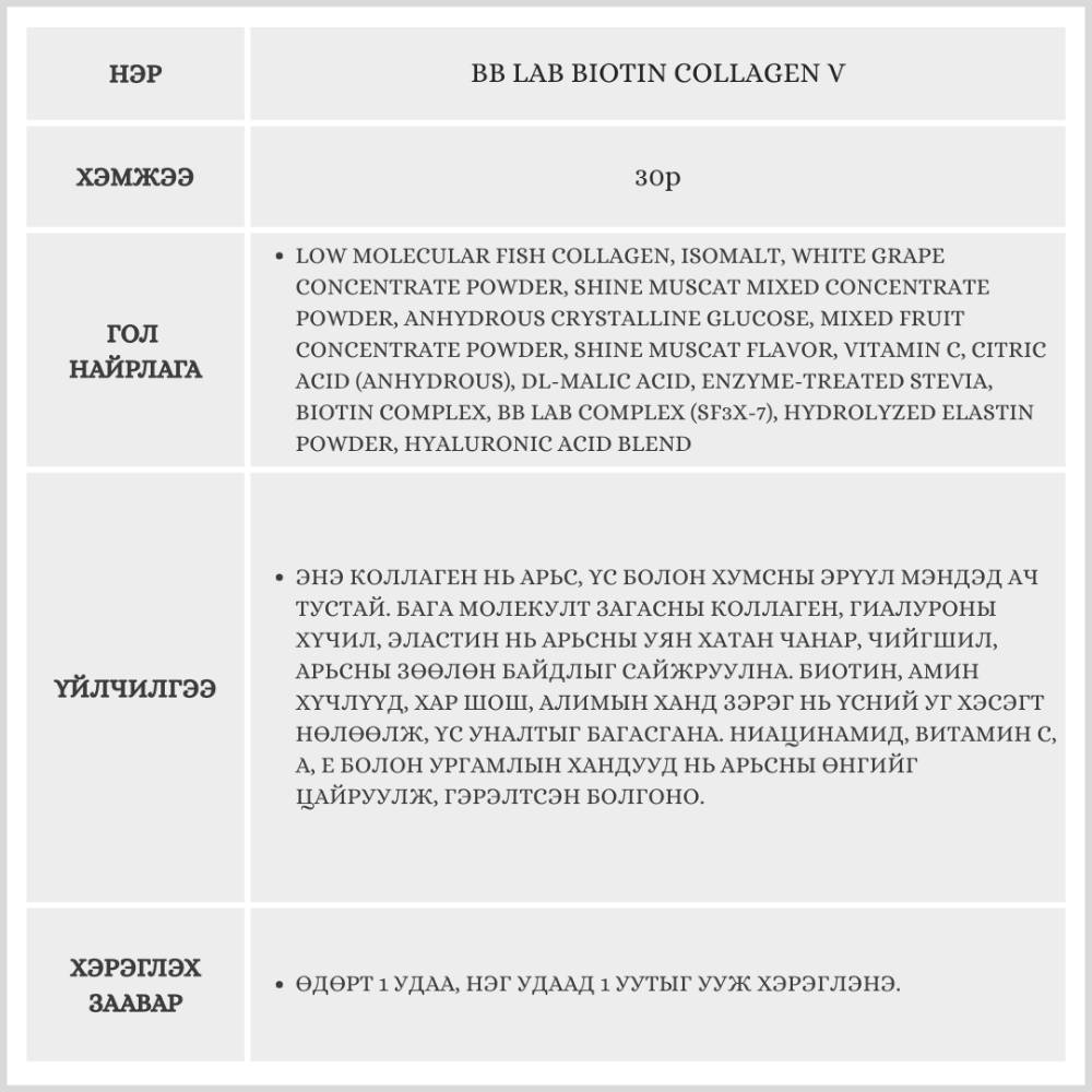 Энэхүү коллаген нь биотин агуулсан бөгөөд арьс, үс болон хумсны эрүүл мэндэд зориулагдсан бүтээгдэхүүн юм. Дотроо 30 ширхэгтэй ба 1 сарын хэрэглээ багтсан. Өглөө ууж хэрэглэвэл биед сайн шимэгдэж өгнө.