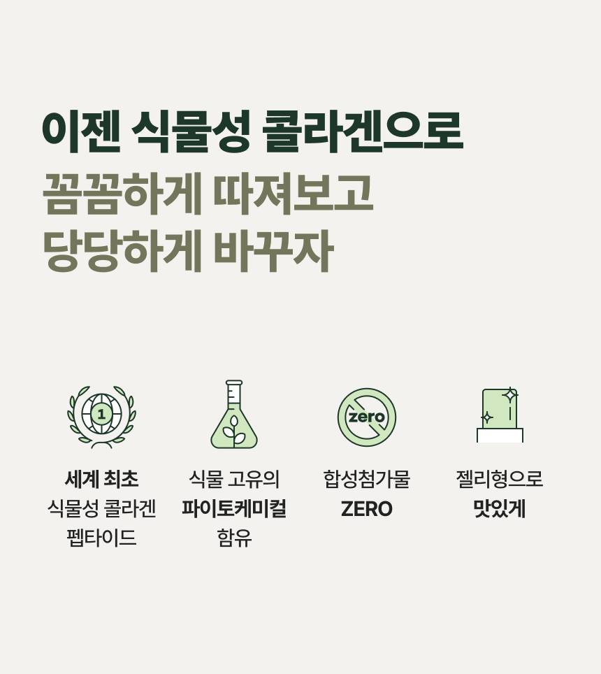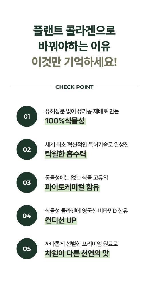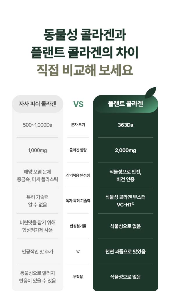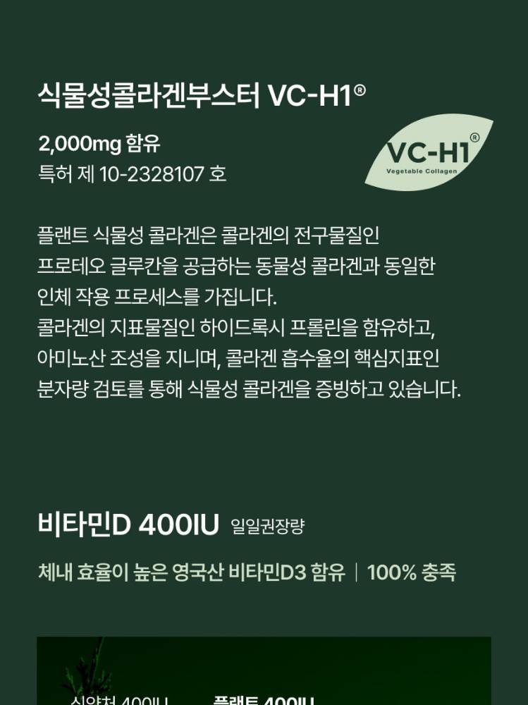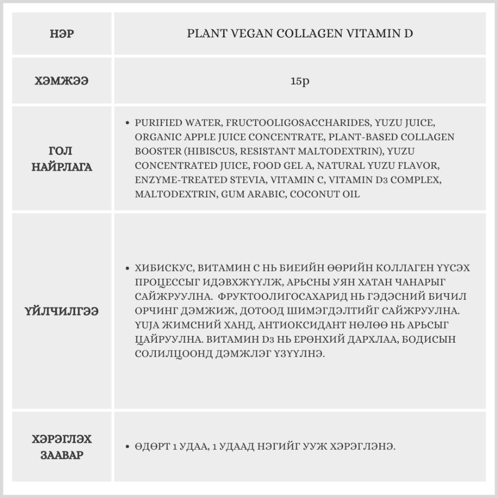 Plant брэндийн уг бүтээгдэхүүн нь ургамлын гаралтай коллаген агуулсан гэдгээрээ онцлог ба желли хэлбэртэй, 15ширхэгтэй. Витамин D агуулсан тул өдөрт уух витамины хэрэгцээг давхар шийдэх боломжтой.