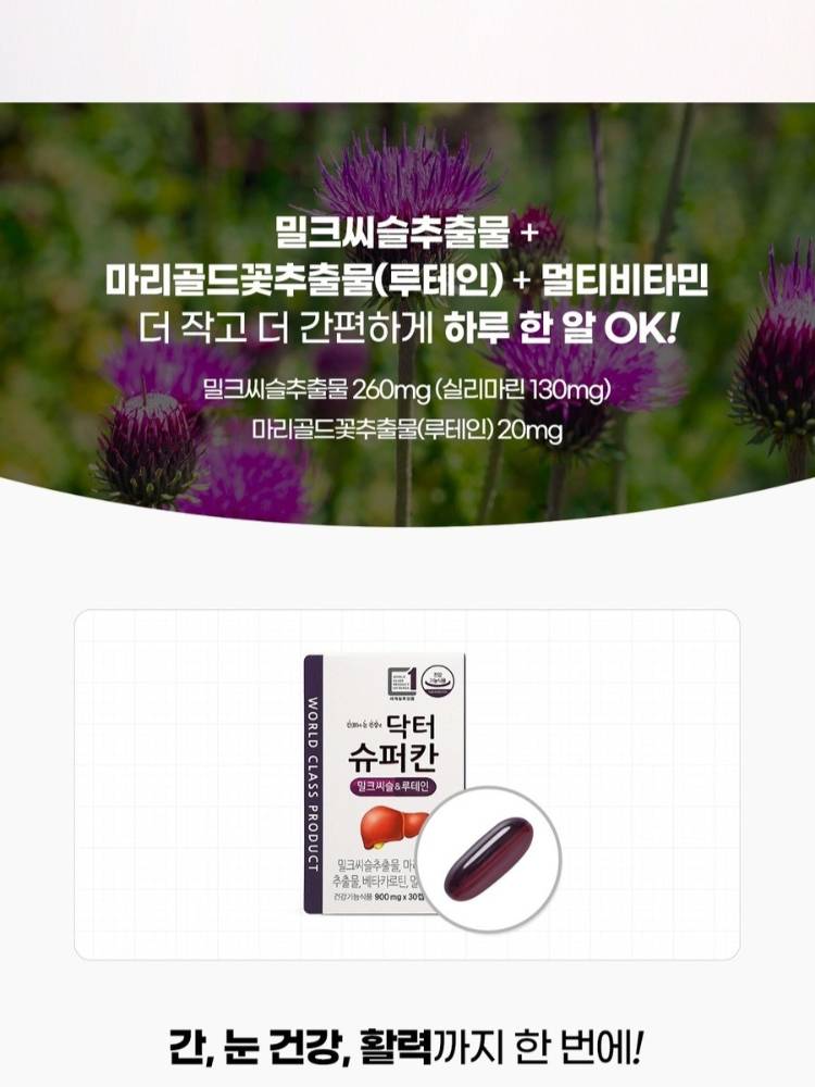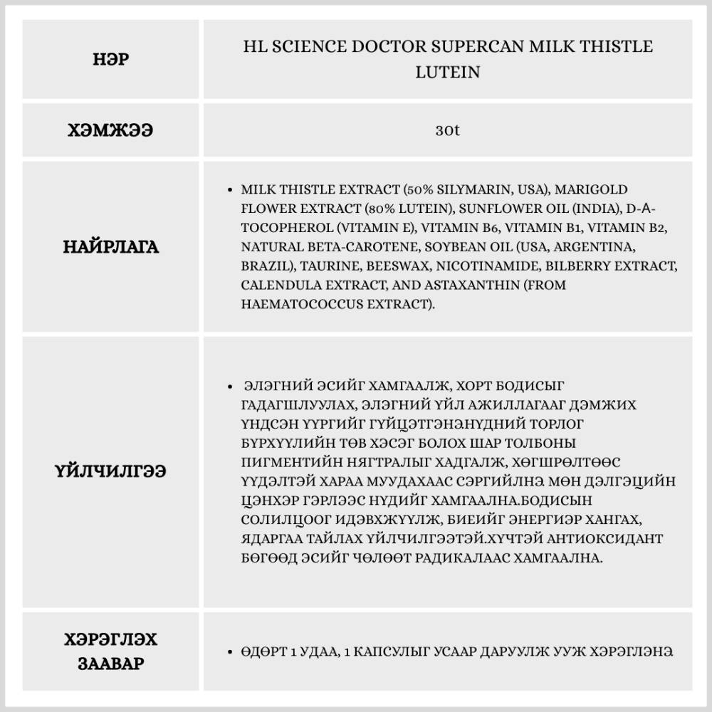 HL Science Doctor Super Kan Milk Thistle Lutein нь орчин үеийн хүмүүсийн хамгийн их ачаалал авдаг хоёр эрхтэн болох элэг болон нүдний эрүүл мэндийг нэг дор дэмжих үйлчилгээтэй бүтээгдэхүүн юм. Хайрцагтаа 30 ширхэгтэй бөгөөд 1 сарын хэрэгцээг хангана.