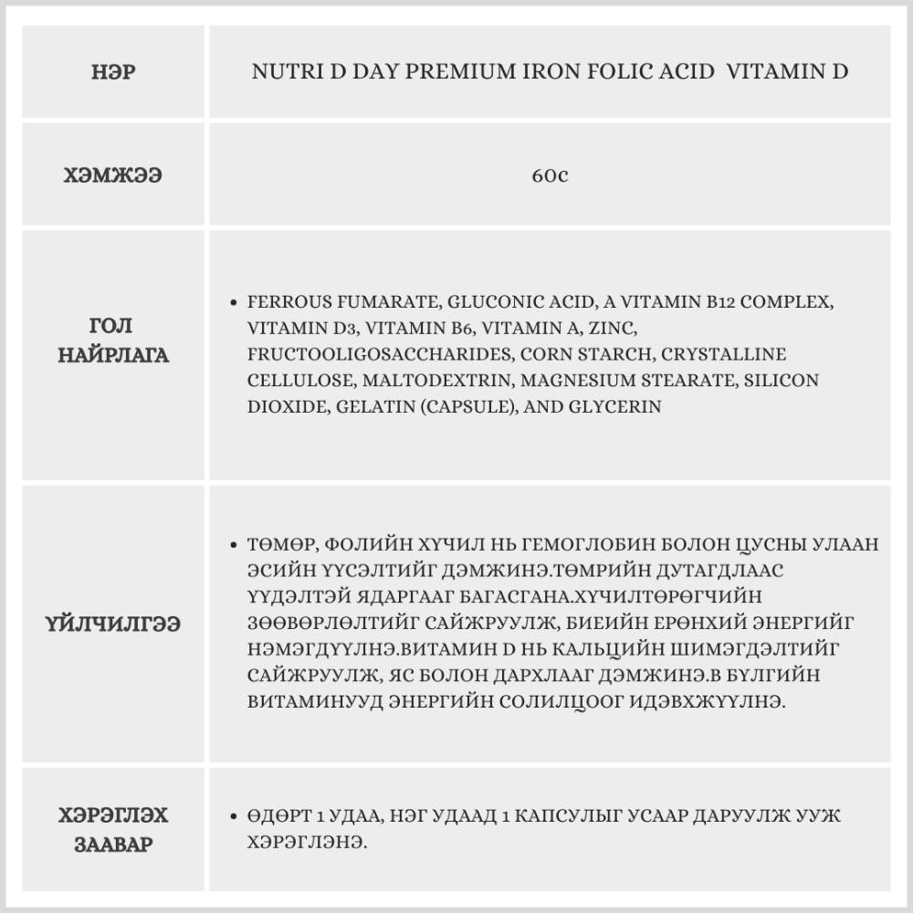 Энэхүү бүтээгдэхүүн нь хайрцагтаа 60 ширхэгтэй бөгөөд 2 сарын хэрэгцээг хангана. Цус төлжүүлж, цус багадалтаас сэргийлэхийн зэрэгцээ эрч хүчийг нэмэгдүүлж, дархлааг дэмжинэ.