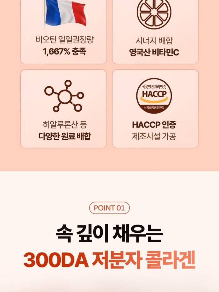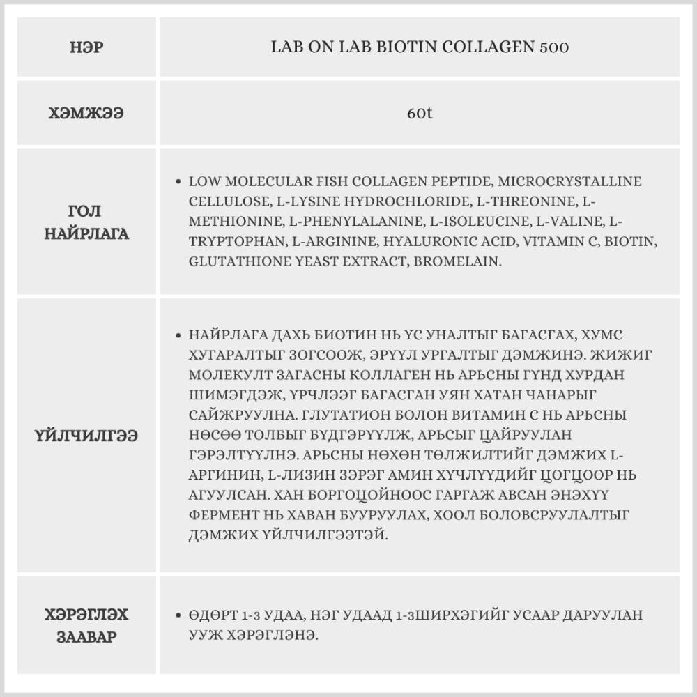 Энэхүү бүтээгдэхүүн нь арьсны уян хатан чанар болон үс, хумсны эрүүл мэндийг дэмжих зорилготой, өндөр шимэгдэлттэй шахмал хэлбэрийн коллаген юм. 500 Дальтон (Da) хэмжээтэй, маш жижиг молекултай тул ердийн коллагенаас илүү үр дүнтэй шимэгддэг.