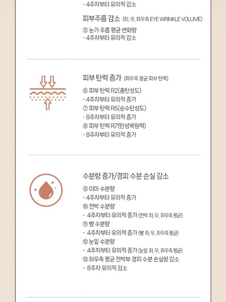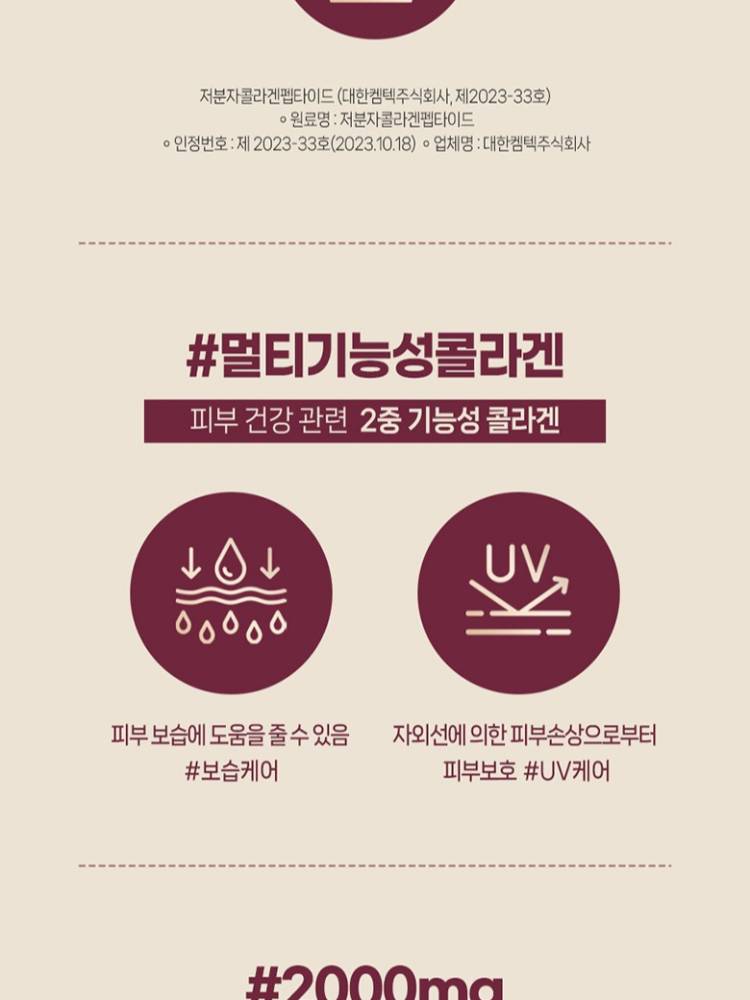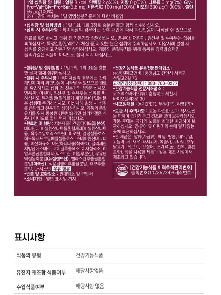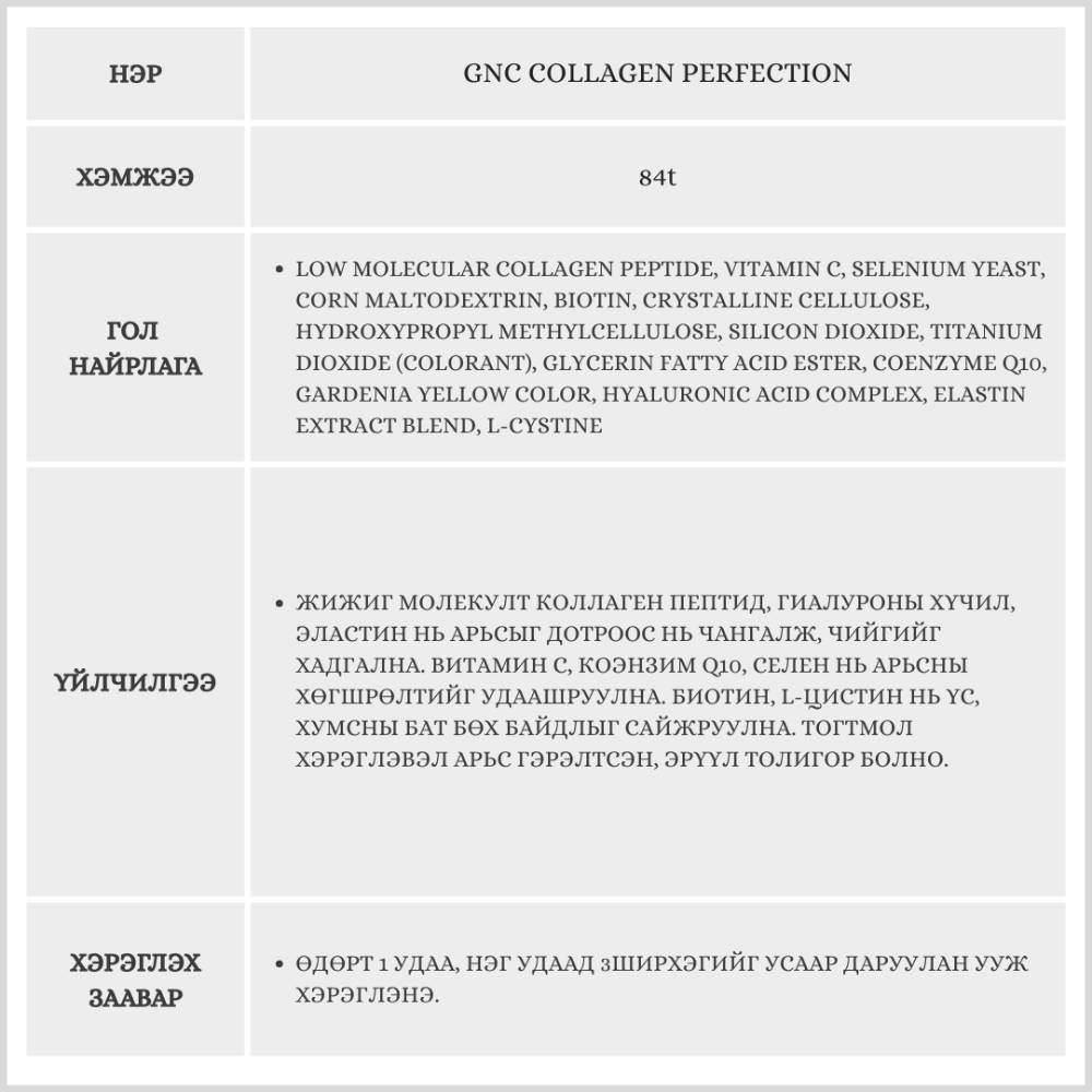 Уг коллаген нь арьсны уян хатан чанар болон чийгшлийг дэмжих үйлчилгээтэй. Мөн арьс нөхөн төлжүүлэх дунгийн ханд болон амин хүчил багтсан ба арьсыг эрүүл, толигор байлгана. Өдөрт 1 удаа 3 ширхэгийг усаар даруулан ууж хэрэглэнэ.
