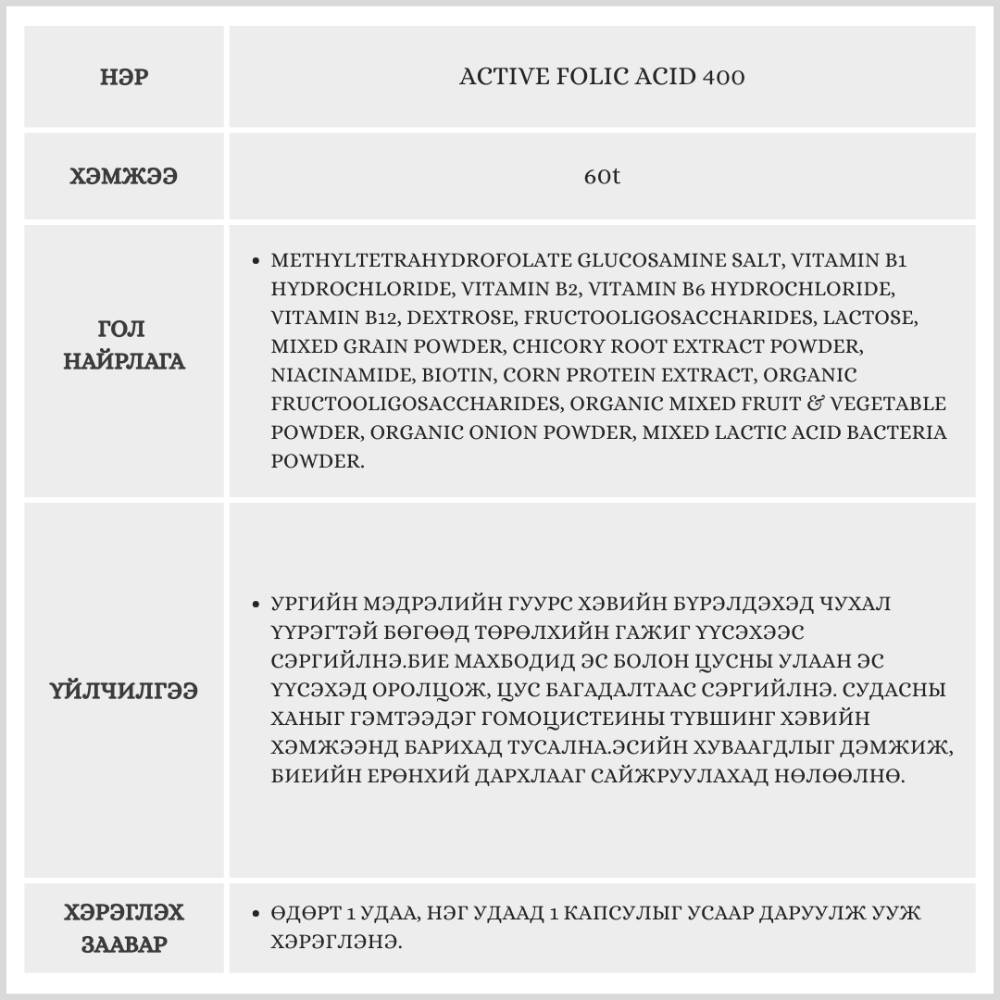 Энэхүү бүтээгдэхүүн нь 60 ширхэгтэй, 2 сарын хэрэглээг агуулсан. Идэвхтэй Фолийн хүчил нь биед шууд шингэж, эсийн хуваагдал, цус төлжилт болон ургийн хэвийн хөгжилд дэмжлэг үзүүлнэ.