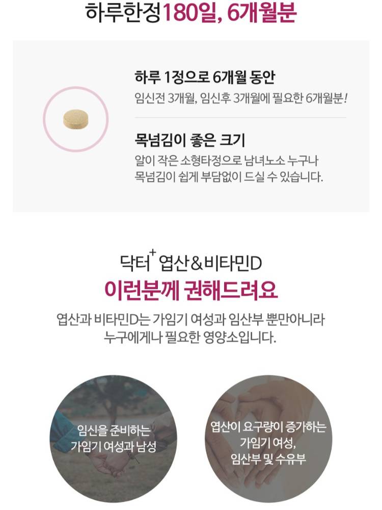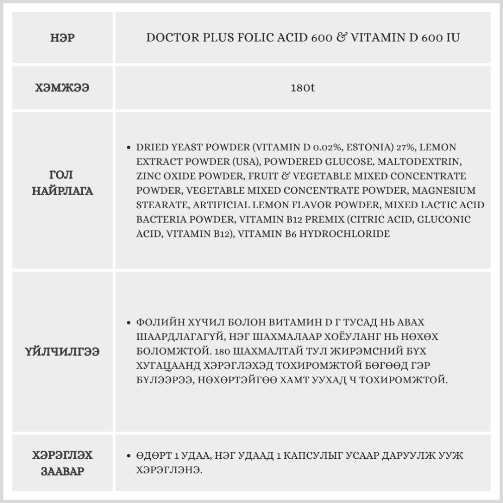 Энэхүү бүтээгдэхүүн нь хайрцагтаа 180 ширхэгтэй бөгөөд 6 сарын хэрэглээг агуулсан. Ургийн гаж хөгжил үүсэхээс сэргийлэхэд тусалж, ургийн мэдрэлийн гуурсны хэвийн хөгжилд эерэгээр нөлөөлнө. Мөн цусны улаан эсийн үүсэлт болон ДНХ ийн нийлэгжилтэд чухал үүрэг гүйцэтгэнэ.