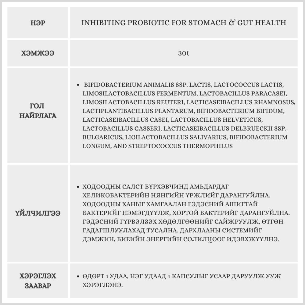 Энэхүү бүтээгдэхүүн нь 30 ширхэгтэй, 1 сарын хэрэглээг агуулсан. Хеликобактерийн эсрэг үйлчилгээ үзүүлж, ходоодны салстыг хамгаална. Гэдэсний ашигтай бактерийг нэмэгдүүлж, өтгөн хаталтаас сэргийлнэ. Давхар цайр агуулсан тул дархлааг дэмжиж, биеийн энергийн солилцоог идэвхжүүлнэ.