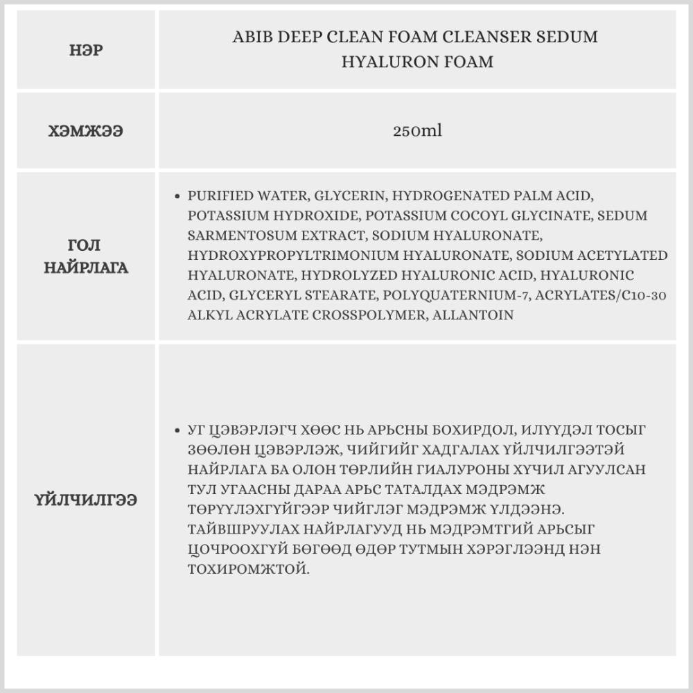 Энэхүү бүтээгдэхүүн нь арьсыг гүн цэвэрлэж, бохирдол ба илүүдэл тосыг зөөлөн арилгахын зэрэгцээ чийгшлийг хадгалах үйлчилгээтэй нүүрний хөөсөн цэвэрлэгч юм. Уг бүтээгдэхүүний гол үйлчилгээ нь нүх сүвийн бохирдлыг сайтар цэвэрлэж, нүүрээ угаасны дараа арьс таталдахгүй, чийглэг мэдрэмж төрүүлнэ.