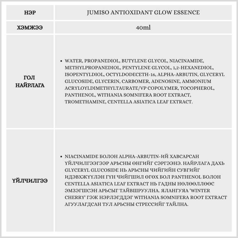 Энэ эссенц нь ядарсан арьсыг сэргээж, чийг өгч илүү гэрэлтсэн, арьсны өнгийг жигдлэхэд туслана.