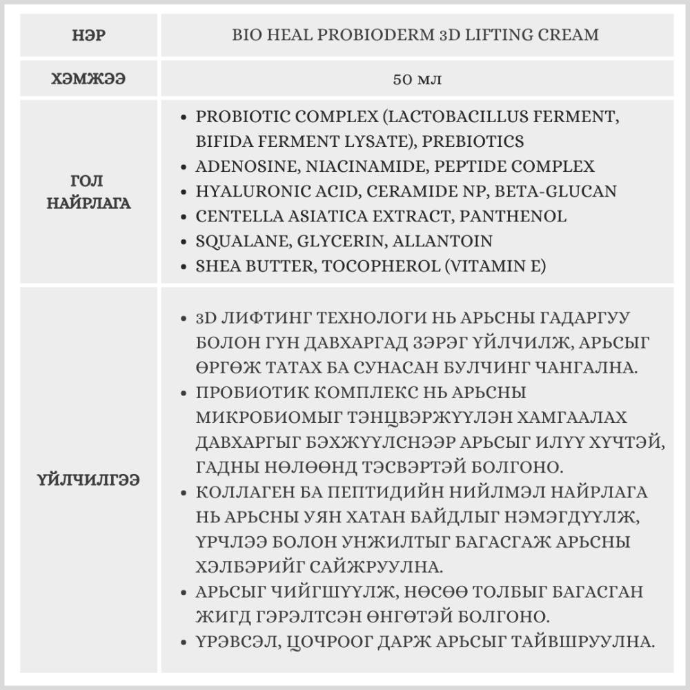 Энэхүү бүтээгдэхүүн нь унжсан арьсыг өргөж, арьсны уян хатан чанарыг сайжруулан, арьсыг толигор зөөлөн болгоно.