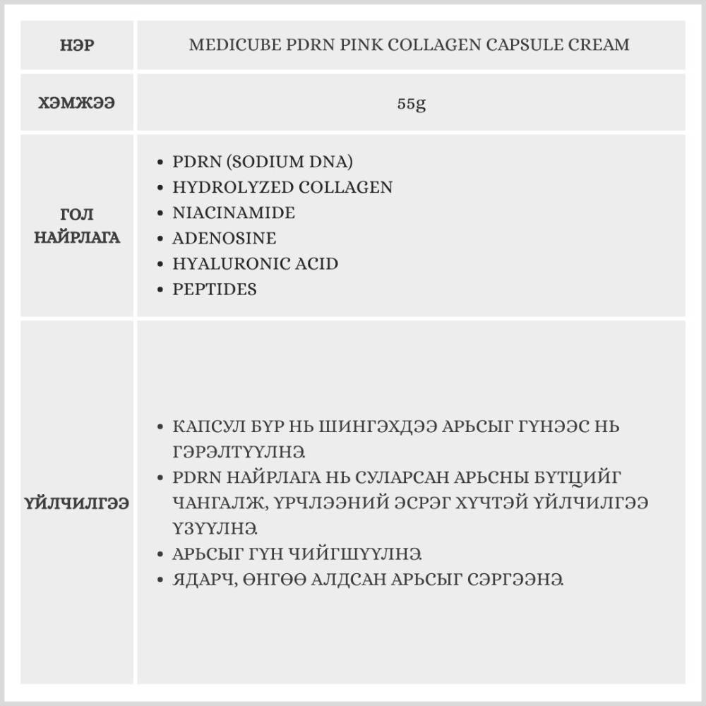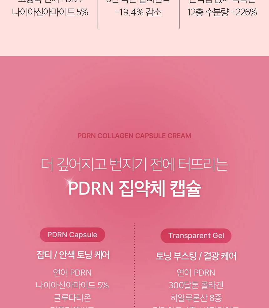 Энэхүү капсултай тос нь арьсыг дотроос нь гэрэлтсэн, булбарай болгох бүтээгдэхүүн юм. Арьсны эсийн нөхөн төлжилтийг дэмжигч PDRN болон коллагены капсул хосолсон тул унжсан арьсыг өргөж, нөхөн төлжүүлэн арьсны өнгийг сэргээнэ.