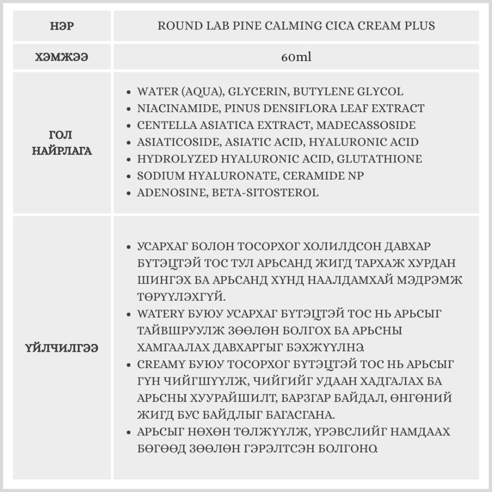 Тосорхог болон усархаг холилдсон давхар бүтэцтэй нүүрний тос. Арьсыг тайвшруулж, чийгшүүлэн зөөлөн болгох ба арьсыг нөхөн төлжүүлж жигд толигор болгоно.
