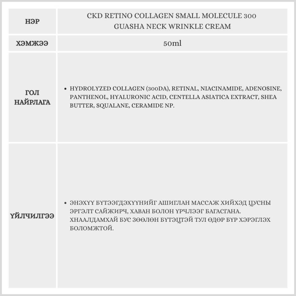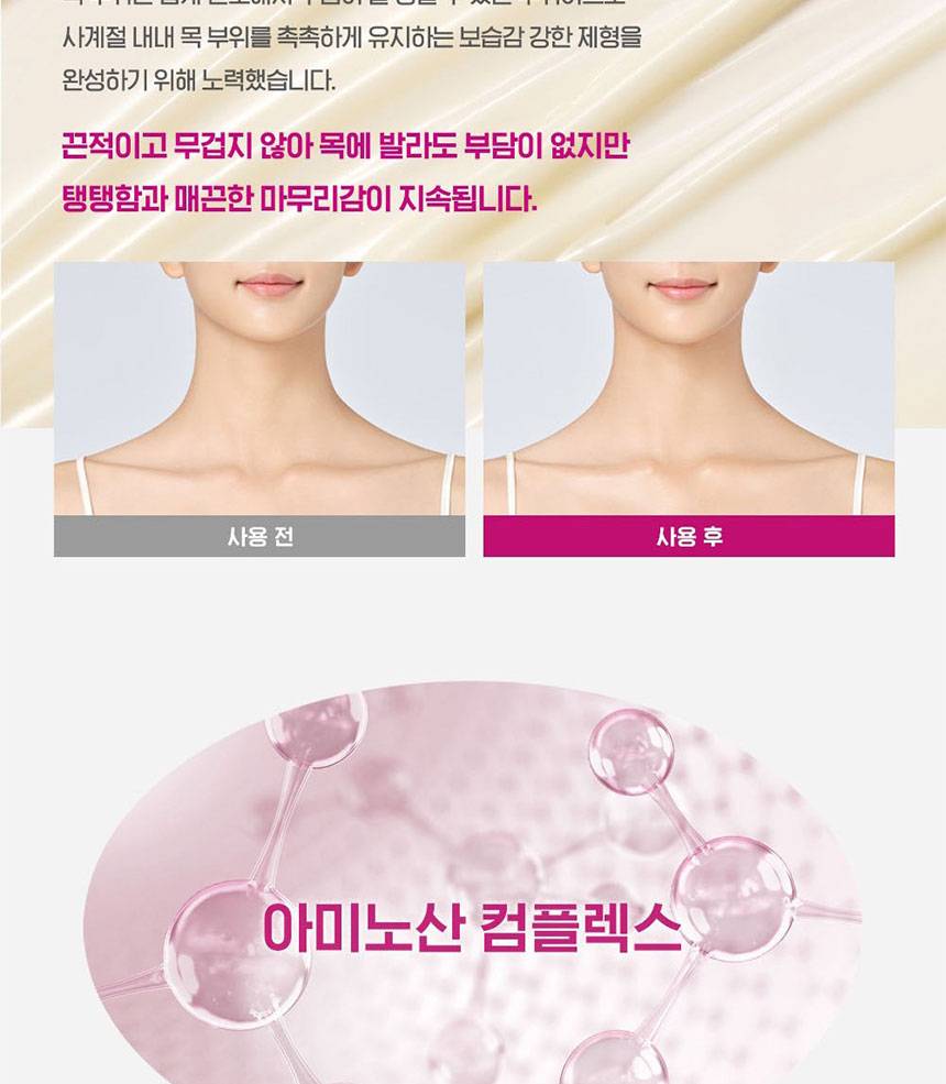 Энэхүү бүтээгдэхүүн нь хүзүүний үрчлээг багасгах тусгай үйлчилгээтэй тос бөгөөд савны урд хэсэгтээ гуашатай тул тосоо түрхэх явцдаа хүзүүндээ массаж хийх боломжтой. 1мл ампул 3 ширхэг дагалдана.