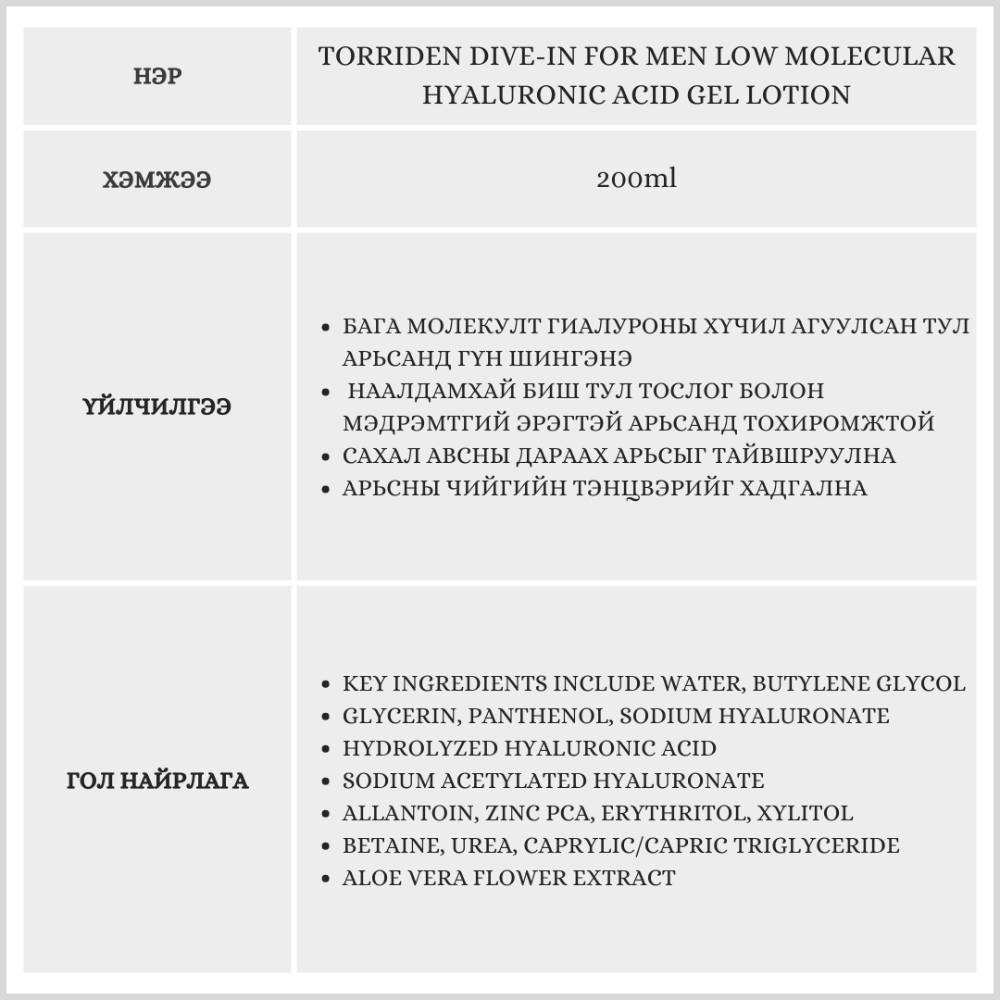 Энэхүү бүтээгдэхүүн нь эрэгтэйчүүдэд зориулсан арьс арчилгааны бүтээгдэхүүн бөгөөд арьсны чийгийг удаан хугацаанд барьж, сахал авсны дараах арьсыг тайвшруулна.