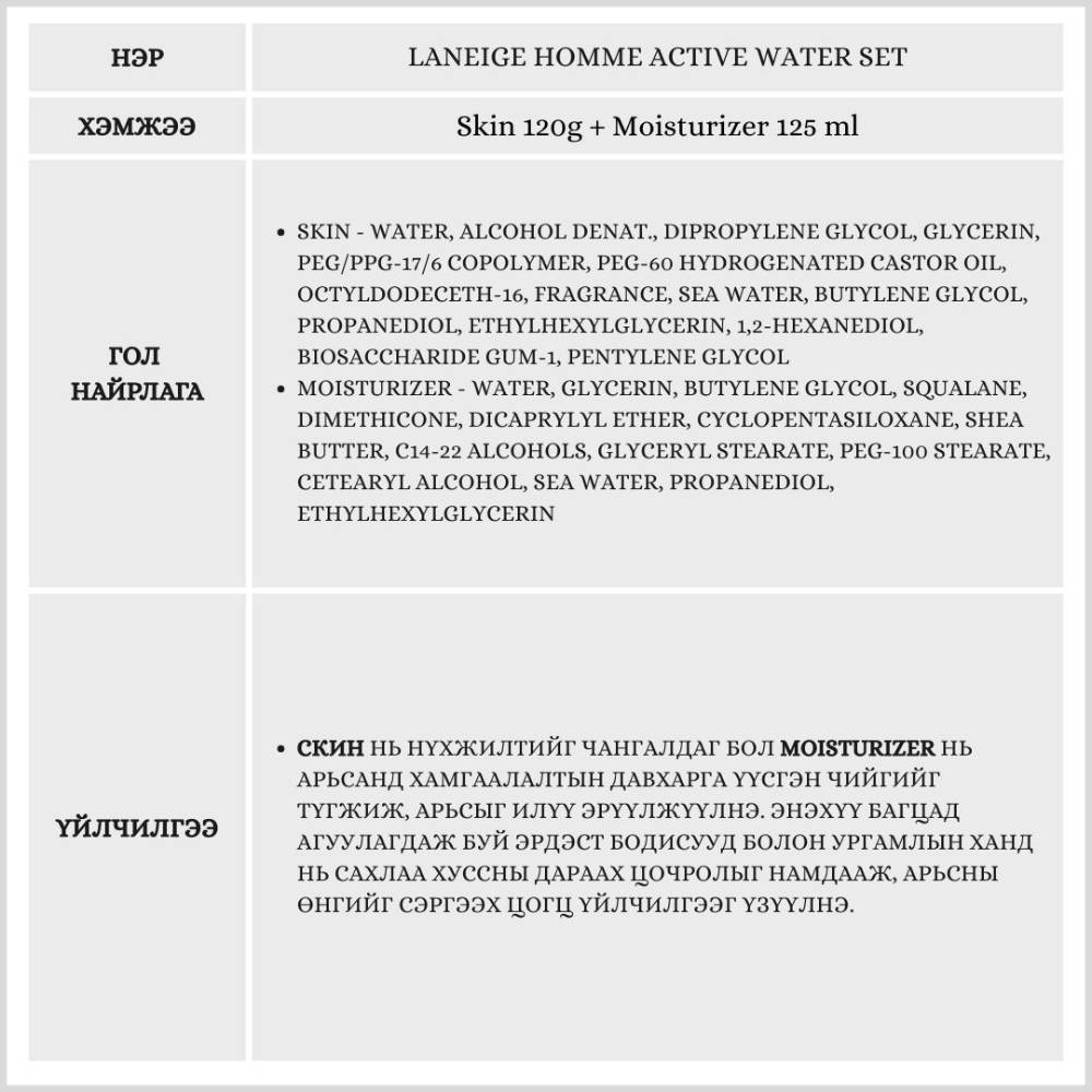 Эрэгтэйчүүдийн арьсны онцлогт тохирсон, арьсыг гүн чийгшүүлж, эрүүл толигор болгох үйлчилгээтэй сет бүтээгдэхүүн юм. Арьсны чийг тосны тэнцвэрийг хадгалж, гадны нөлөөнөөс болж ядарсан арьсыг эрүүлжүүлнэ.