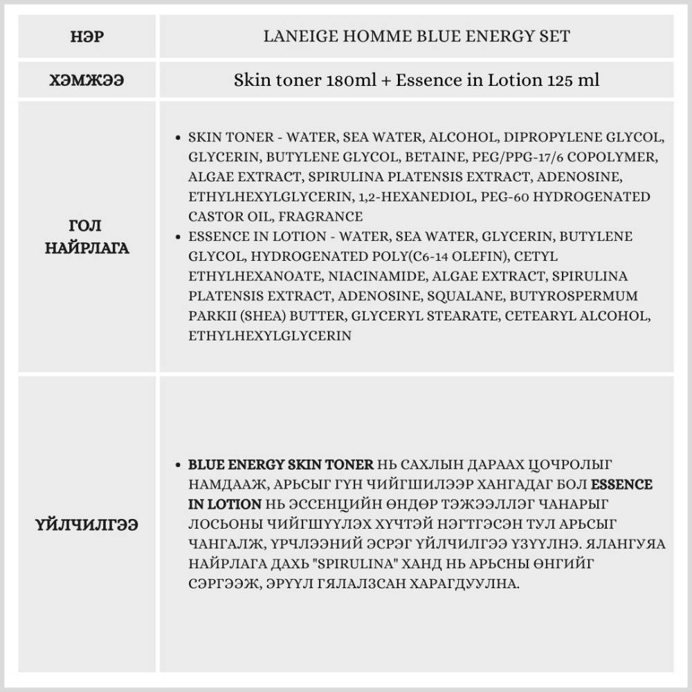 Энэхүү сет нь ядарсан арьсанд эрч хүч өгч, арьсыг чангалан, өнгийг нь сэргээх хөгшрөлтийн эсрэг/anti aging/үйлчилгээтэй. Далайн гүний эрдэст ус болон замагны ханд агуулсан тул ядарсан арьсыг эрүүлжүүлэн, гүн чийгшүүлнэ.