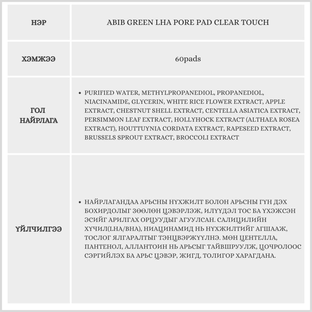 Энэхүү бүтээгдэхүүн нь LHA буюу зөөлөн хүчил агуулсан тул арьсыг цочроолгүйгээр нүхжилт, арьсны гүн дэх бохирдол, илүүдэл тос, үхэжсэн эсийг цэвэрлэж, арьсны бүтцийг жигдрүүлнэ. Усархаг, зөөлөн найрлагатай учир хэрэглэсний дараа наалдамхай биш, сэрүүн мэдрэмж төрүүлнэ.