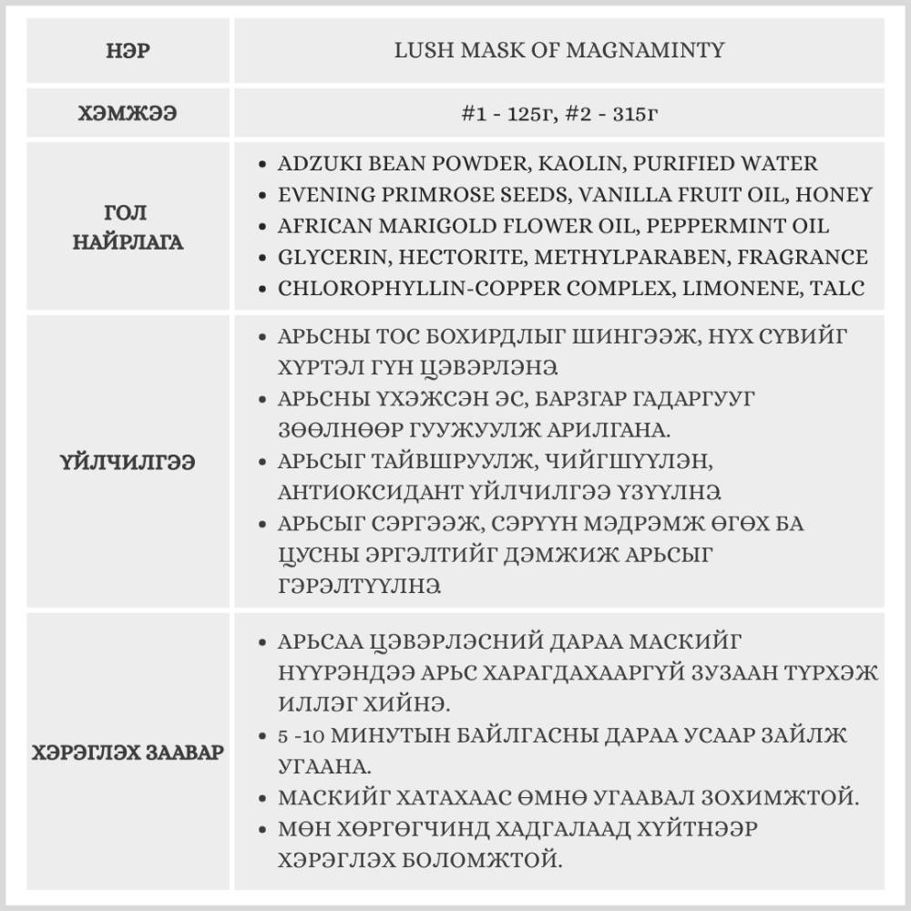 Арьсны бохирдлыг маш сайн гүн цэвэрлэж, арьсыг толигор гэрэлтсэн болгох үйлчилгээтэй угаадаг маск. Антиоксидант үйлчилгээтэй тул арьсыг тайвшруулж, өнгийг сэргээнэ.