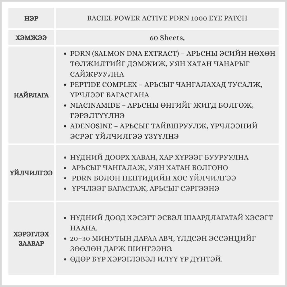 PDRN (салмон ДНХ) болон пептидийн найрлагатай нүдний маск бөгөөд арьсны уян хатан чанарыг нэмэгдүүлж, хар хүрээ, нүдний доорх уут, үрчлээг багасгана. Өндөр концентрацтай эссэнц нь арьсны гүн давхаргад нэвтэрч, арьсыг нөхөн сэргээж, гэрэлтсэн, толигор болгоно.