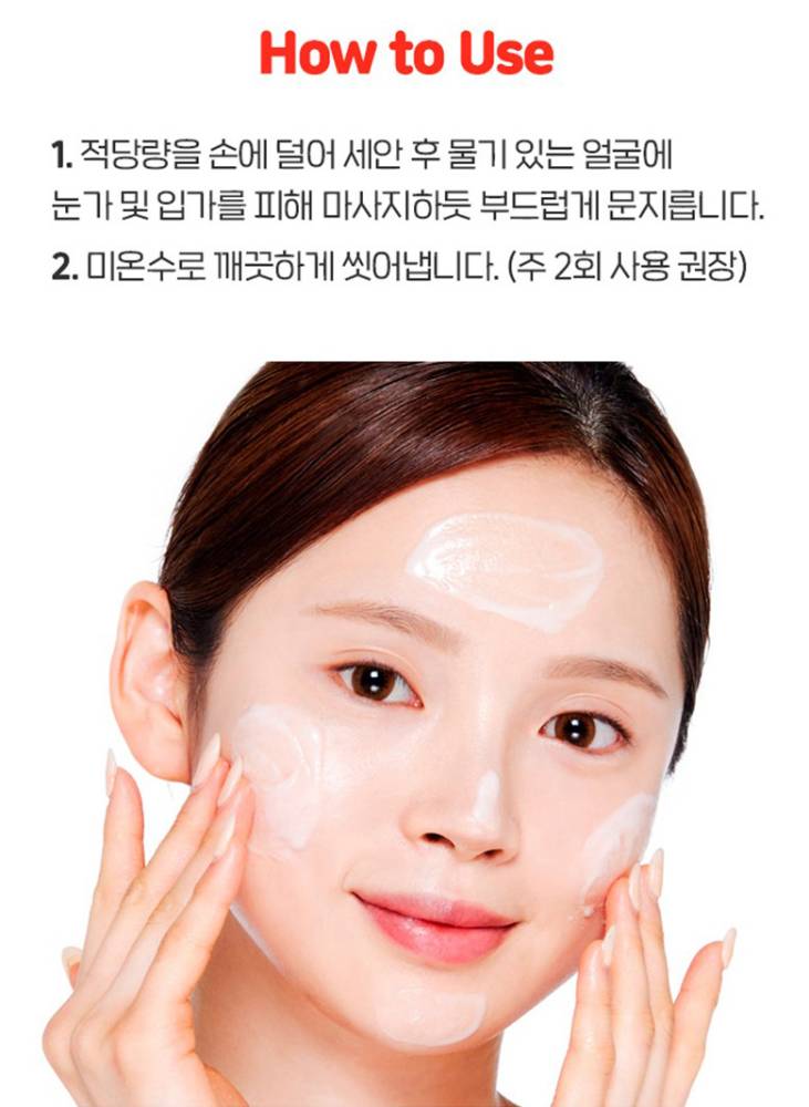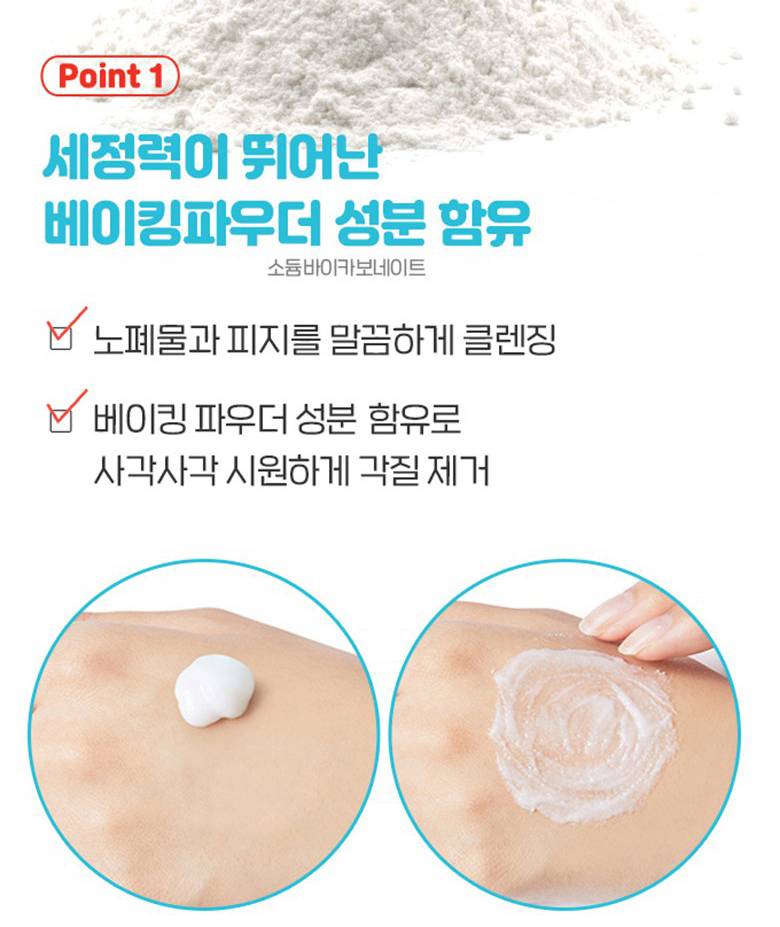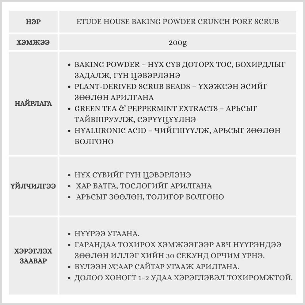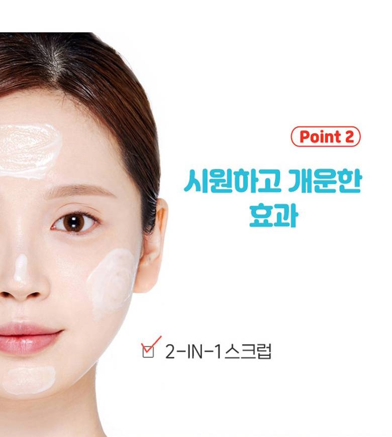 Нүүрний нүх сүвийг цэвэрлэж, илүүдэл тос, үхэжсэн эсийг зөөлөн гуужуулна. Нарийн ширхэгтэй baking powder болон микр скрабын ширхэгтэй гүн цэвэрлэгээний скраб бөгөөд арьсны бохирдол, хар батга, тослогийг гүнээс нь арилгаж, арьсыг зөөлөн болгоно.